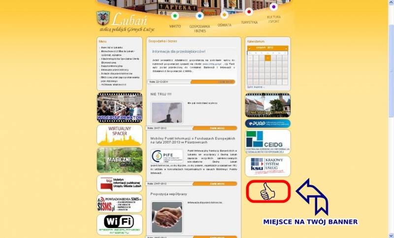 Z racji wymienionych wyżej względów miejska strona internetowa to doskonałe miejsce do zaprezentowania Państwa Firmy. Mając na uwadze fakt, że jedną z najpopularniejszych form jaką przyjmuje reklama internetowa są banery, dajemy Państwu możliwość umieszczania ich na łamach oficjalnej strony miejskiej. Jesteśmy przekonani, że pomogą one wykreować, wzmocnić lub utrzymać pozytywny wizerunek waszej firmy. Z naszej strony zapewniamy atrakcyjne miejsce w ramach serwisu, ogromną przestrzeń reklamową, solidność, profesjonalną obsługę oraz bardzo korzystne warunku finansowania ogłoszeń reklamowych. Jeżeli chcą Państwo stać się znaną i rozpoznawalną firmą, poszukują Państwo nowych możliwości dotarcia do klienta, zapraszamy do współpracy. O jej szczegółach można dowiedzieć się więcej dzwoniąc do Łużyckiego Centrum Rozwoju pod nr 75 722 25 41 lub wysłać wiadomość na adres e-mail promocja@luban.pl.