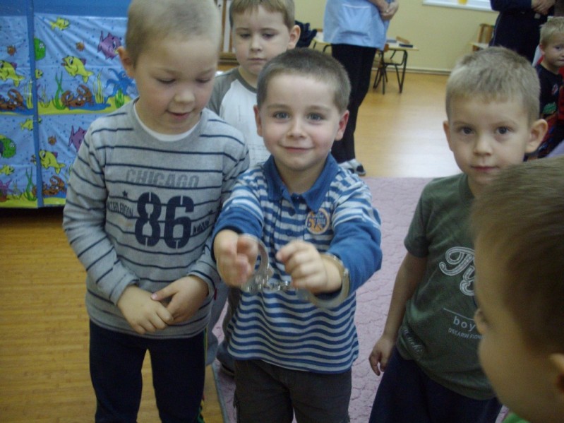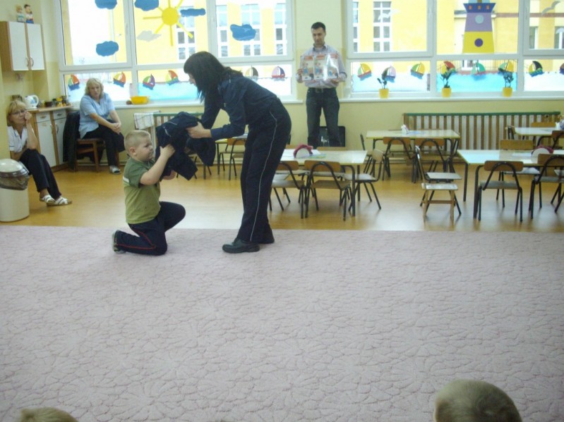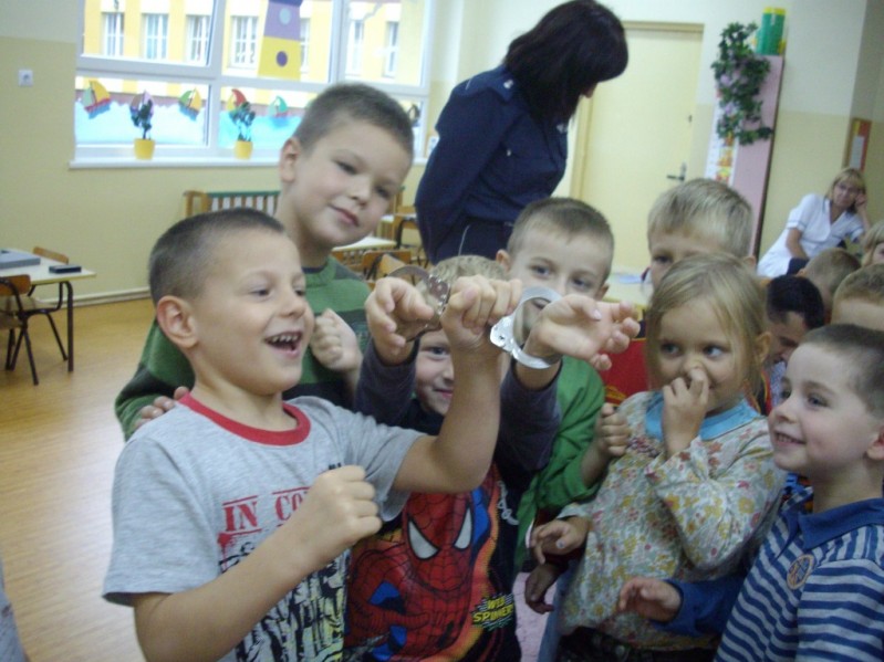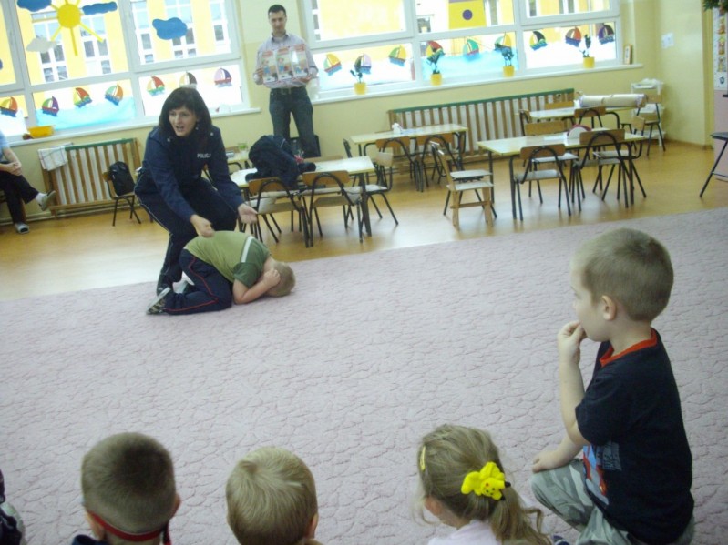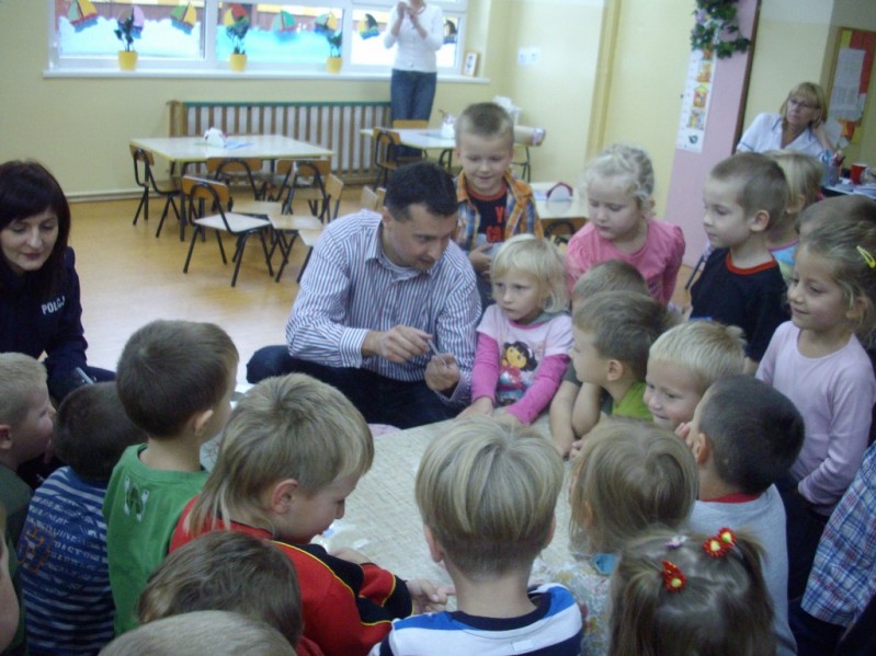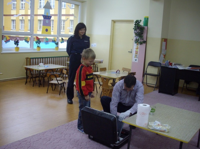 Ogromnym zainteresowaniem cieszyły się pokazy i ćwiczenia praktyczne, podczas których dzieci poznały najbezpieczniejszy sposób obrony przed groźnym psem. Przedszkolaki                    z entuzjazmem ćwiczyły pozycję ,,żółwika”. Mogły także obejrzeć odznakę policyjną,  kajdanki oraz zapoznać się z pracą technika policyjnego, który pokazał dzieciom tajniki „zbierania odcisków”-  każdy maluch dostał na pamiątkę odcisk własnego kciuka. Od dzisiaj z pewnością żaden przedszkolak nie będzie obawiał się spotkania z funkcjonariuszem. Policjant będzie kojarzył się, jako osoba, do której można zwrócić się o pomoc.