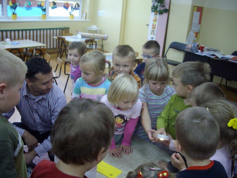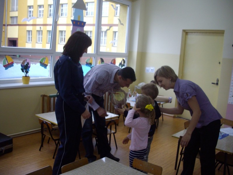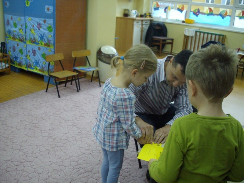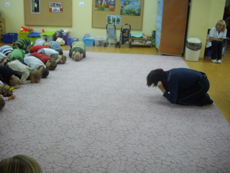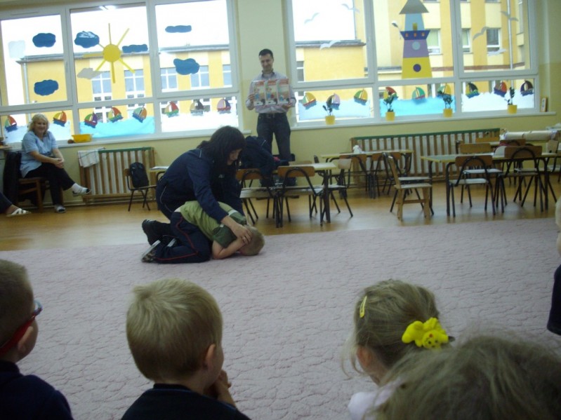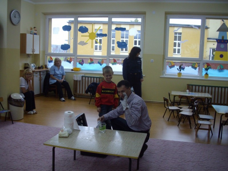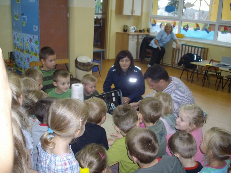 Ogromnym zainteresowaniem cieszyły się pokazy i ćwiczenia praktyczne, podczas których dzieci poznały najbezpieczniejszy sposób obrony przed groźnym psem. Przedszkolaki                    z entuzjazmem ćwiczyły pozycję ,,żółwika”. Mogły także obejrzeć odznakę policyjną,  kajdanki oraz zapoznać się z pracą technika policyjnego, który pokazał dzieciom tajniki „zbierania odcisków”-  każdy maluch dostał na pamiątkę odcisk własnego kciuka. Od dzisiaj z pewnością żaden przedszkolak nie będzie obawiał się spotkania z funkcjonariuszem. Policjant będzie kojarzył się, jako osoba, do której można zwrócić się o pomoc.