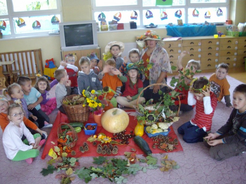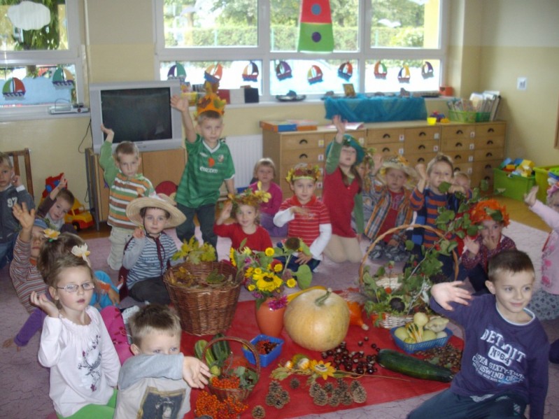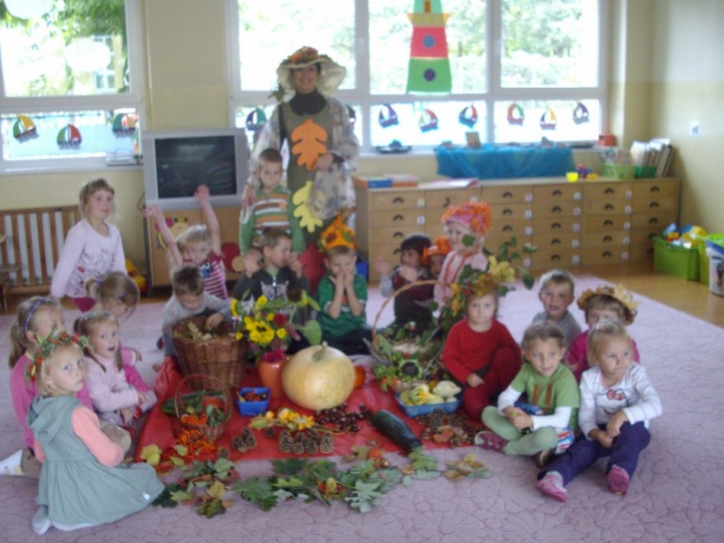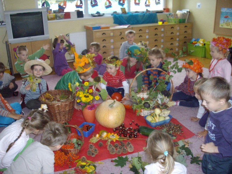 Wykonaliśmy piękny kapelusz i korale dla Pani Jesieni, układaliśmy jesienne bukiety i kompozycje z kasztanów i żołędzi. Przyniesione dary jesieni stały się wspaniałym ,,materiałem” do przeliczania i klasyfikowania oraz wzbogaciły kąciki przyrody w naszych salach. Teraz będziemy szukać jesieni podczas naszych leniwych spacerków. Cóż, żegnaj lato na rok!