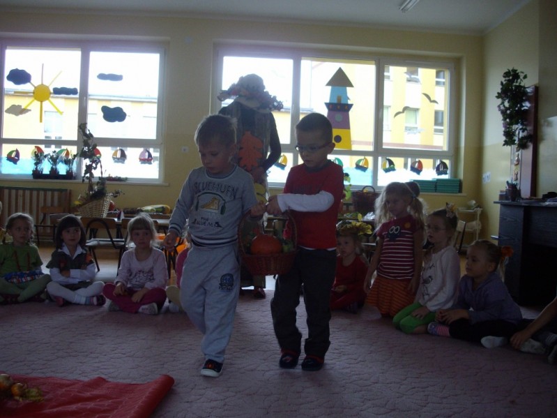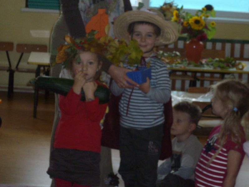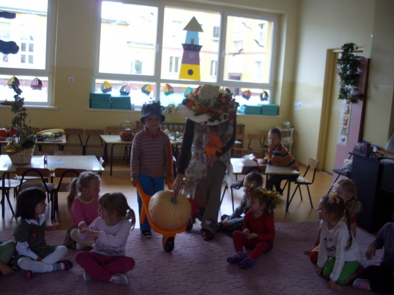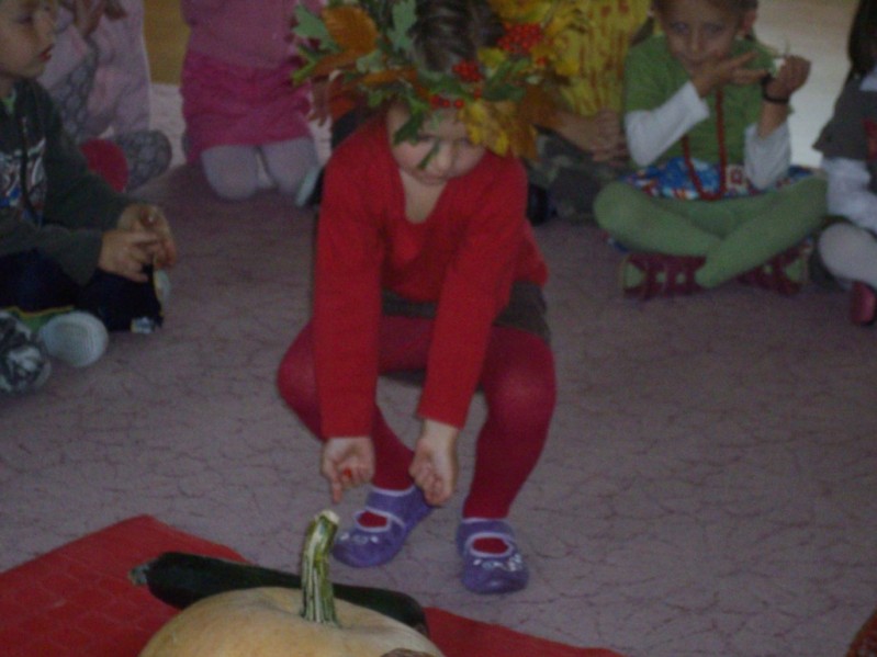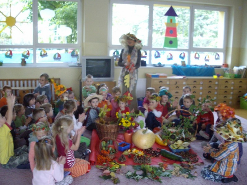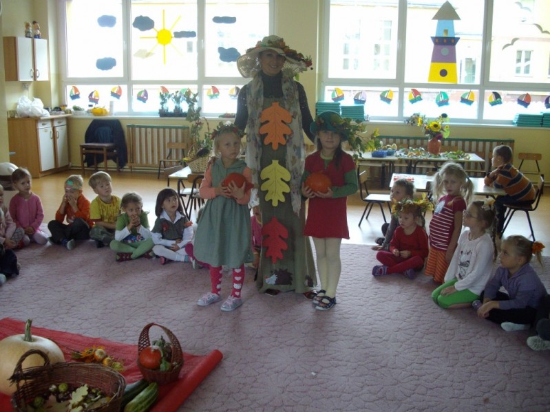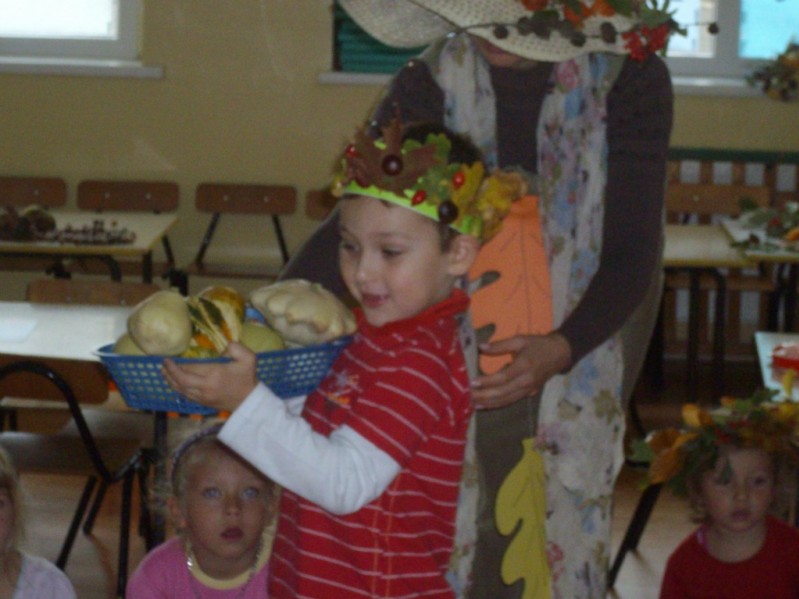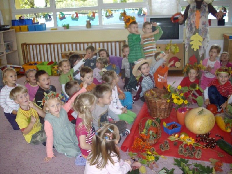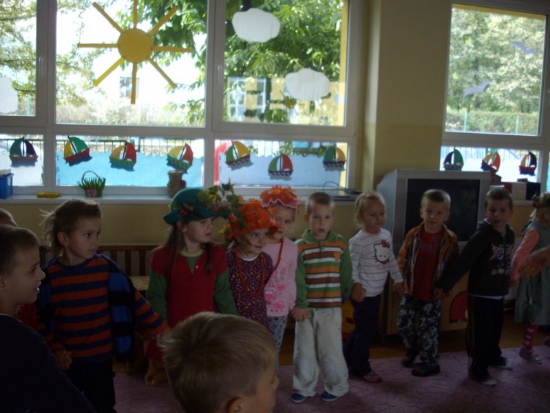 Dnia 24.09.2012 r. dzieci z grupy III i IV wraz ze swoimi paniami witały Panią Jesień w naszym przedszkolu.Przedszkolaki w tym dniu miały na sobie ubranka w jesiennych kolorach i fantastyczne nakrycia głowy – za co serdecznie dziękujemy rodzicom.