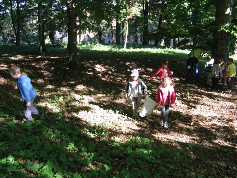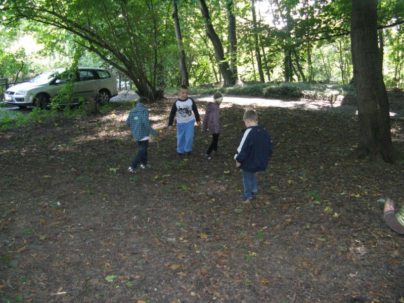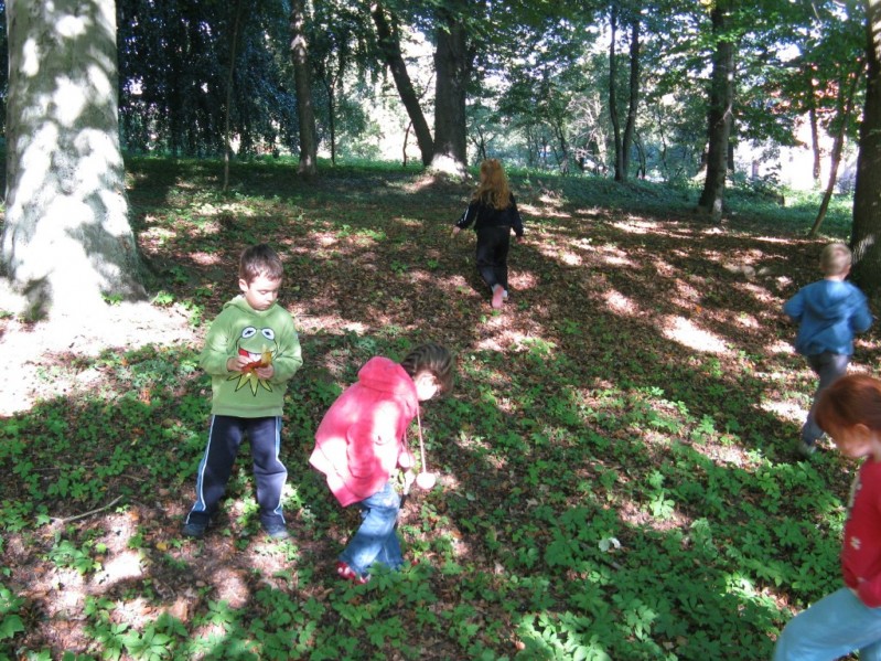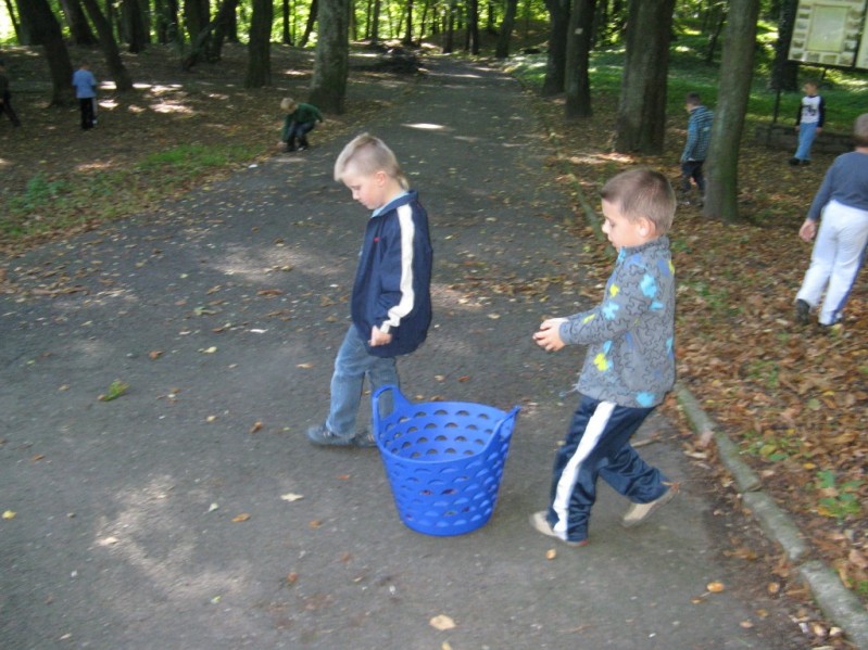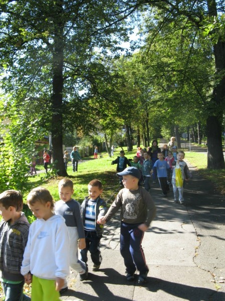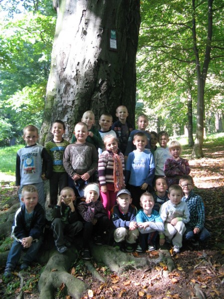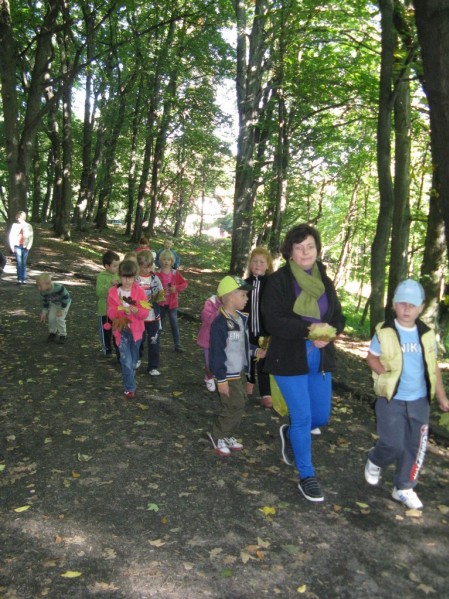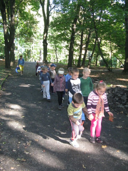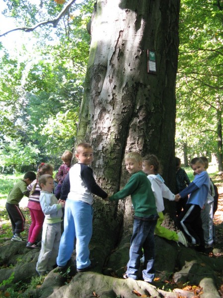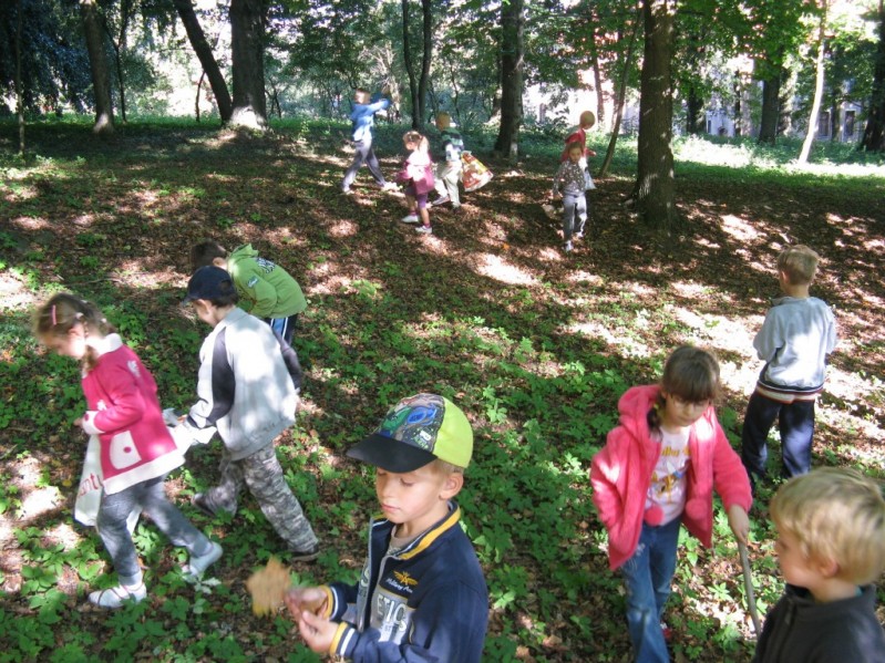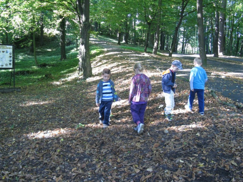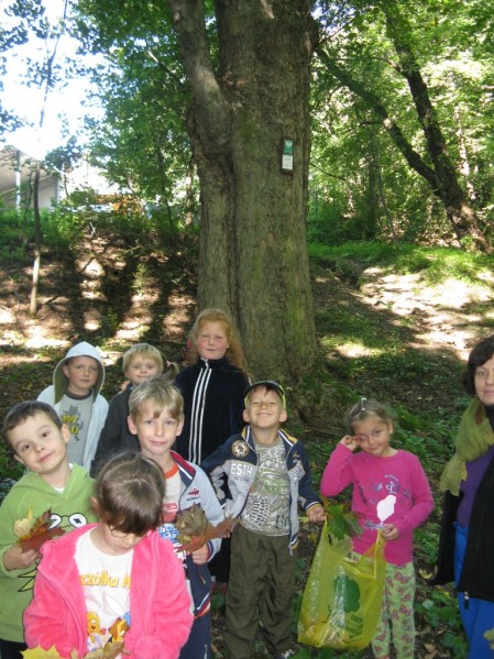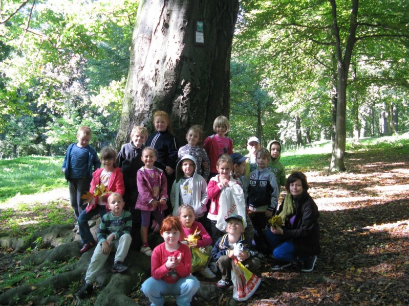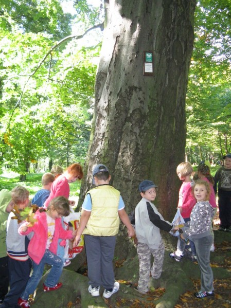 Dzieci szukały śladów jesieni, zbierały ciekawe okazy do kącika przyrody. Największą frajdę sprawiło im tropienie pomników przyrody. Wszystkie pomniki - drzewa prezentowały się okazale, ale starszakom najbardziej spodobał się 210- letni Sercjan. Był to nie tylko najstarszy ale i najszerszy pomnik przyrody. Aby go objąć potrzeba było aż 16 dzieci. Ta wyprawa zapewne pozostanie na długo w pamięci przedszkolaków.