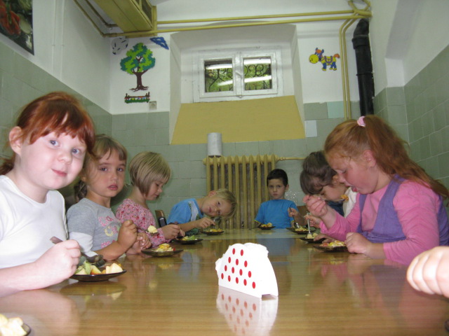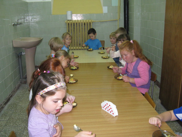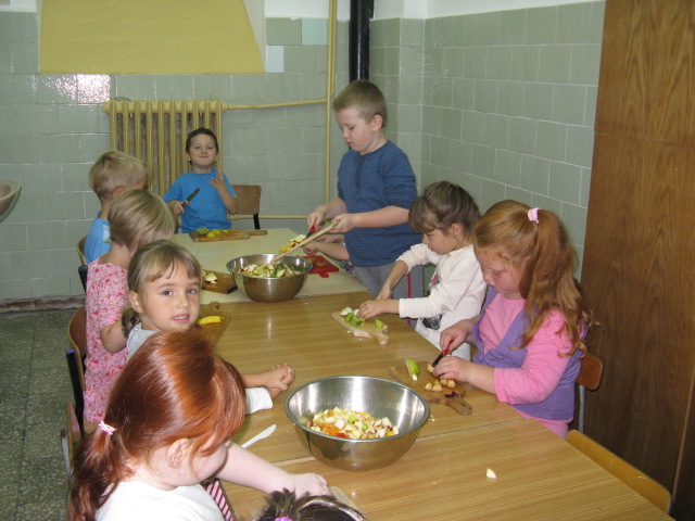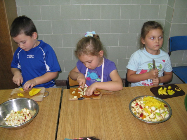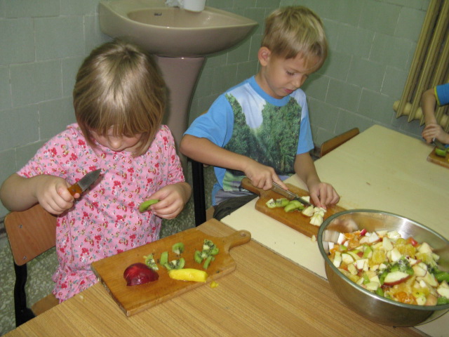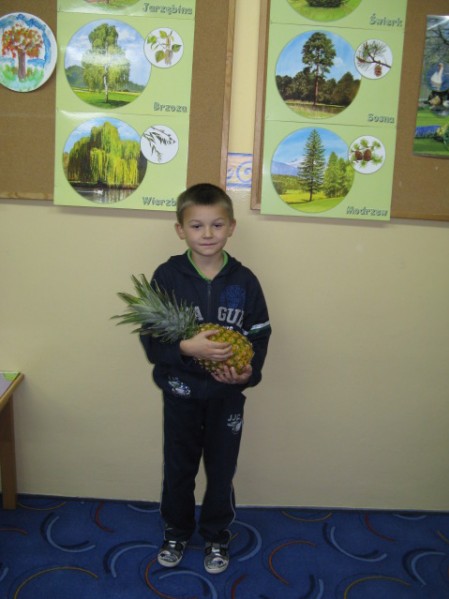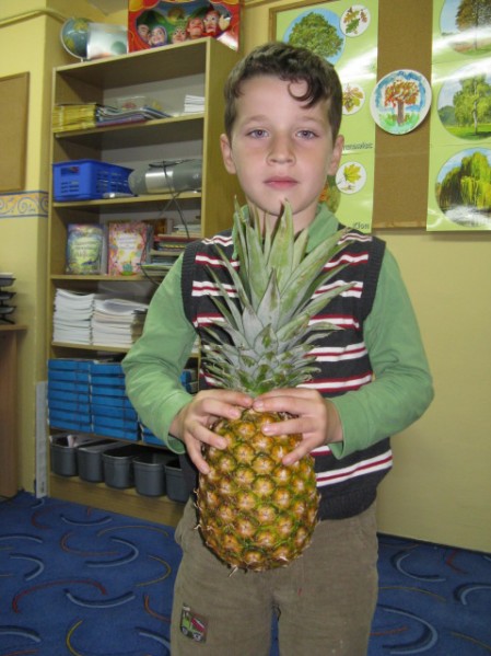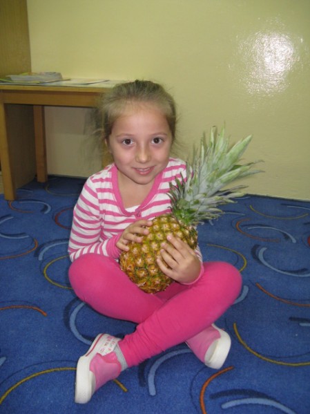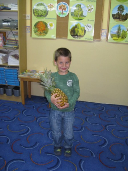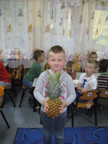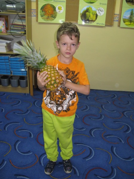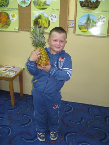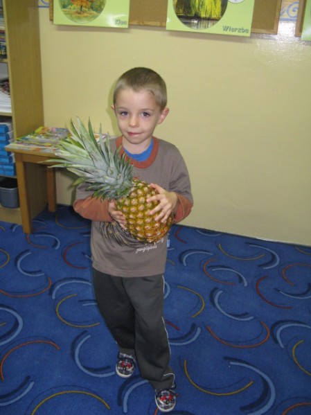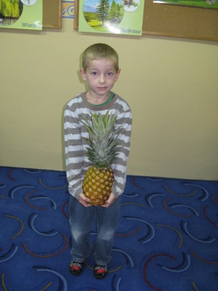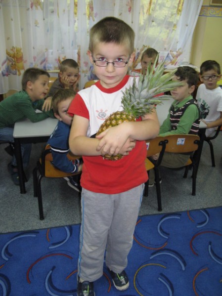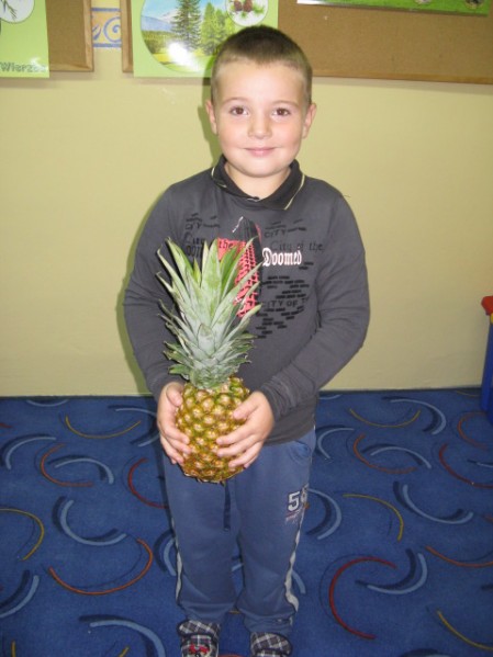 Dzieci z grupy V i VI bardzo się natrudziły przy krojeniu owoców. Sałatka z dodatkiem miodu i sosu jogurtowego bardzo im smakowała. Starszaki z dumą częstowały swoje panie i personel SP nr 3. Jednak największym hitem dnia okazał się ananas- słodziutki i soczysty. A tak przy okazji, my już wiemy co to jest bromelina. A wy?