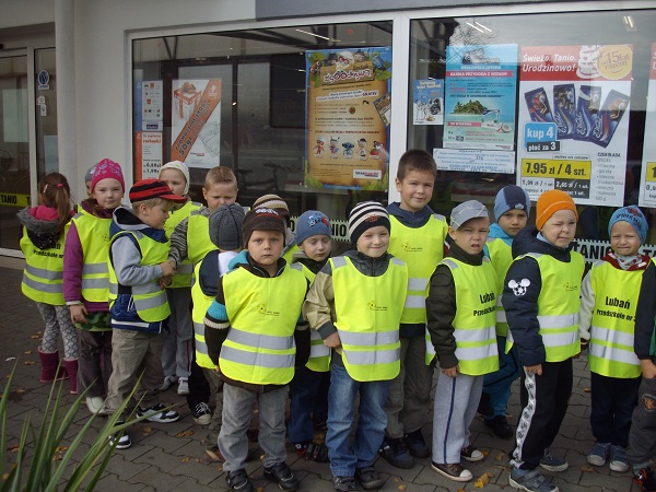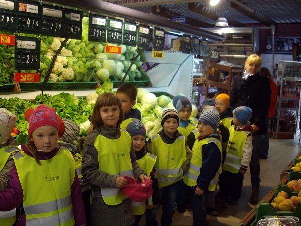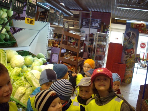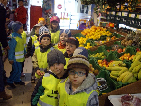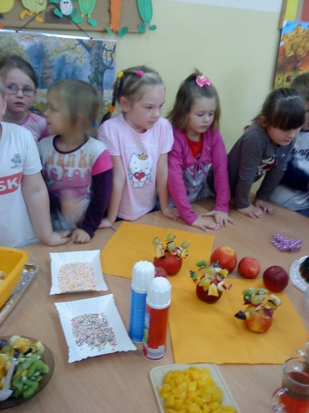 Przedszkolaki razem ze swoimi paniami wybrały się więc do sklepu, gdzie zakupiły potrzebne składniki, a przy okazji miały okazję skonfrontować swoją wiedzę na temat wyglądu i nazw owoców zarówno krajowych, jak i egzotycznych.  Na drugi dzień, kiedy galaretka  odpowiednio stężała , mali smakosze ochoczo zabrali się do pracy. Przygotowaliśmy stoły, na których znalazły się umyte, obrane i pokrojone owoce oraz galaretka, bita śmietana , kolorowe posypki i… zaczęło się owocowe szaleństwo. Każdy mógł samodzielnie komponować swój deserek i nabijać na wykałaczkę ulubione owoce. Wesoły nastrój udzielił się także naszej pani Dyrektor, którą zaprosiliśmy na ,,owocowe małe co nieco”. Było wesoło