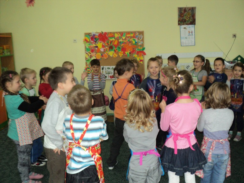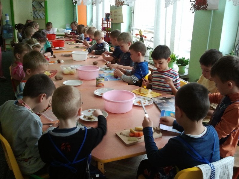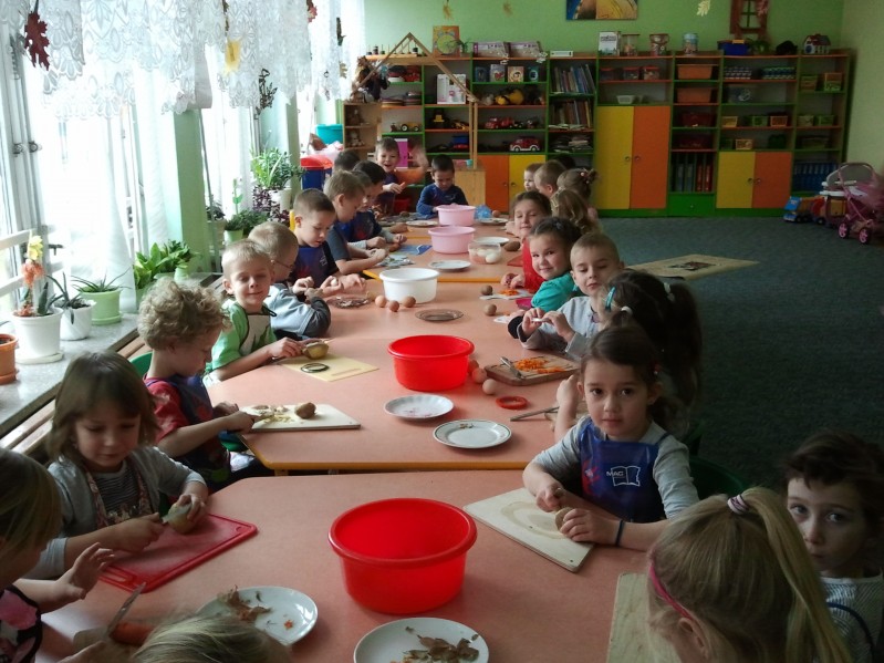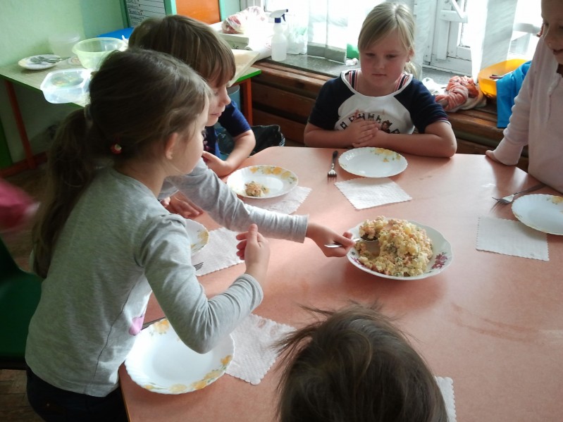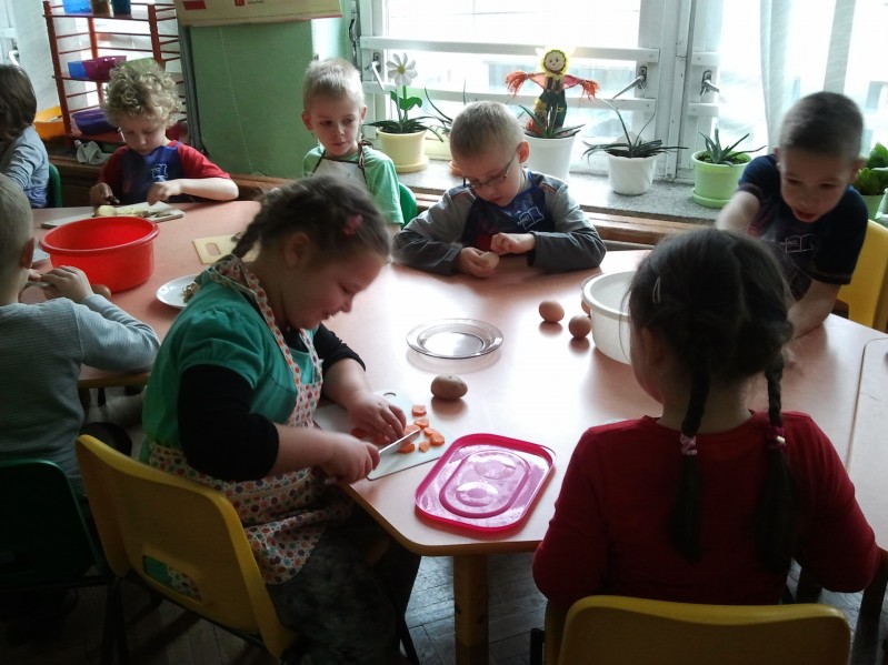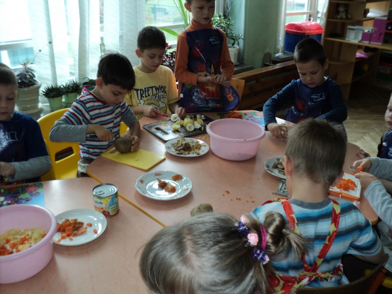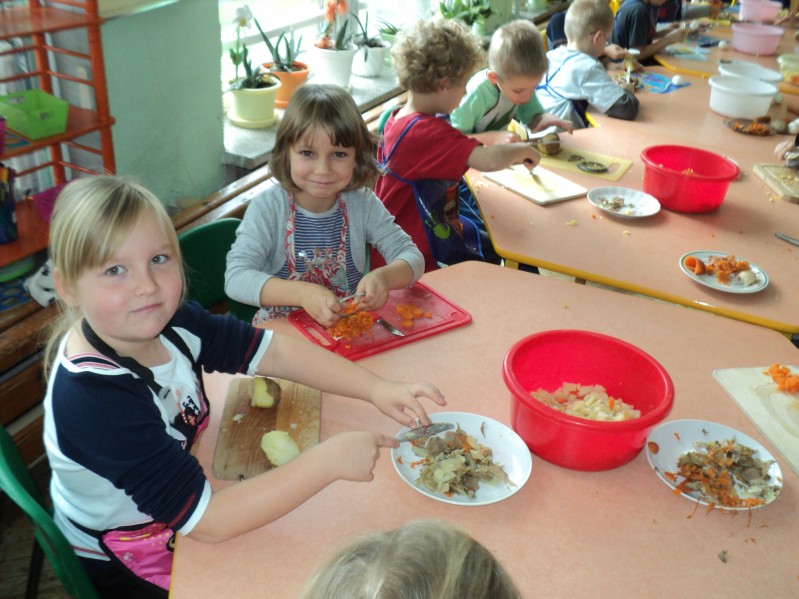 W ramach realizacji programu " Akademia zdrowego przedszkolaka" dzieci z grupy VII w PM nr 5 wykonywały sałatkę jarzynową. W tym dniu starszaki przyniosły ugotowane warzywa i produkty potrzebne do wykonania pysznej sałatki. Dzieci pamiętały o ubraniu fartuszków i dokładnym umyciu rąk, a także o przestrzeganiu bezpieczeństwa podczas posługiwania się nożem. Na wstępie dzieci wypowiadały się na temat: "Co można zrobić z warzyw?" Bawiliśmy się przy piosence "Sałatka jarzynowa". Potem wszyscy zabrali się z zapałem do pracy. Nastąpiło obieranie, krojenie, mieszanie i przyprawianie, a potem degustacja. Poczęstowano również inne grupy w przedszkolu.