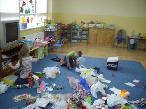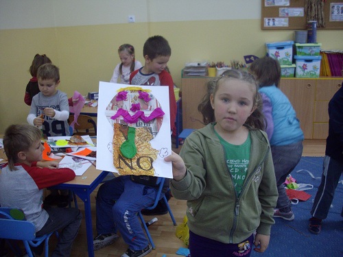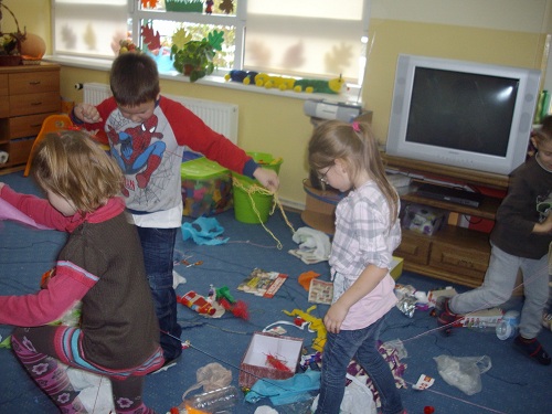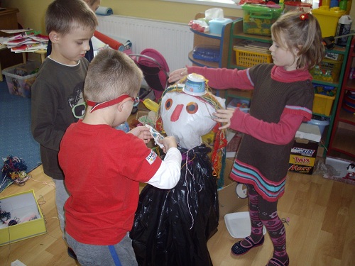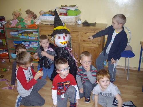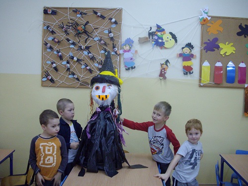 Przedszkolaki wysypując na środek dywanu swoje ,,czyste śmieci” miały okazję przekonać się, jak szybko można zaśmiecić powierzchnię sali i ziemi. Ze zgromadzonych odpadów dzieci miały za zadanie wykonać różnego rodzaju "śmieciowe stwory". Temat wywołał wiele emocji, a pomysłów nie brakowało. W związku ze zbliżającym się świętem Halloween oraz dużą ilością zgromadzonych surowców wtórnych, wspólnie wykonaliśmy także postać Baby – Jagi, która w asyście ,, Śmieciowych Potworów” i dyń stała się fantastyczną dekoracją naszej szatni.