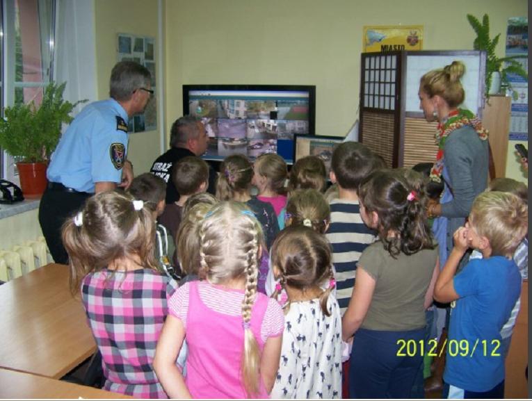 Spotkanie rozpoczęło się pogadanką na temat bezpieczeństwa dzieci, gdzie wspomniano min. o zasadach bezpiecznego przechodzenia przez jezdnię w drodze do i z przedszkola.  Następnie dzieci zapoznały się z pracą dyżurnego i z zaciekawieniem  obserwowały jak działa monitoring miasta.