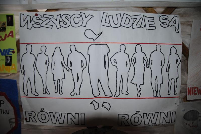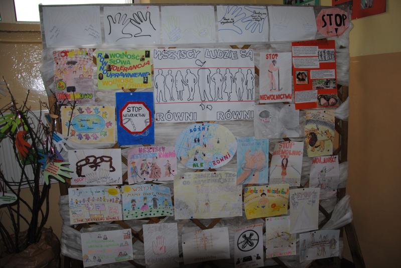 Aby godnie uczcić Międzynarodowy Dzień Praw Człowieka przygotowaliśmy w naszej szkole tablice okolicznościowe. Już wcześniej, uczniowie klas piątych i szóstych, realizując na zajęciach historii tematy dotyczące niewolnictwa i myśli doby oświecenia przygotowali plakaty, których tematyką był protest przeciw nierównemu traktowaniu ludzi w przeszłości i dziś.