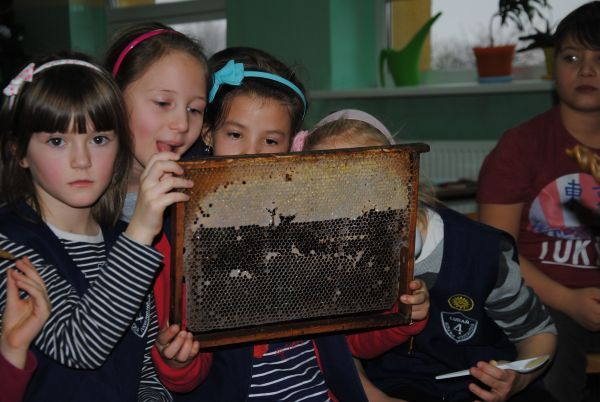 Zaprosiliśmy więc na spotkanie dziadka naszego kolegi z klasy – Piotrka. 16 stycznia 2013 roku pan Wiesław Dziechciarz – pszczelarz zawitał w naszej klasie z „kawałkiem” ula, ale bez pszczół. Podczas spotkania opowiadał nam o życiu roju w ulu i o tym, z czego powstaje miód. A najbardziej to zachwalał lecznicze właściwości miodu, wosku pszczelego a nawet jadu pszczół! Tak, właśnie. Dowiedzieliśmy się, że APITERAPIA to dziedzina medycyny, zajmująca się leczeniem za pomocą produktów pszczelich. Wąchaliśmy przyjemnie pachnące świece z wosku pszczelego, smakowaliśmy aromatyczny miód i mieliśmy okazję zadawać mnóstwo pytań. To była bardzo ciekawa lekcja. Polecamy wszystkim spotkanie z pszczelarzem. Nawet w styczniu.