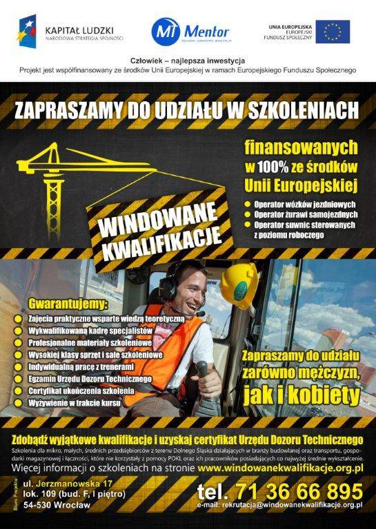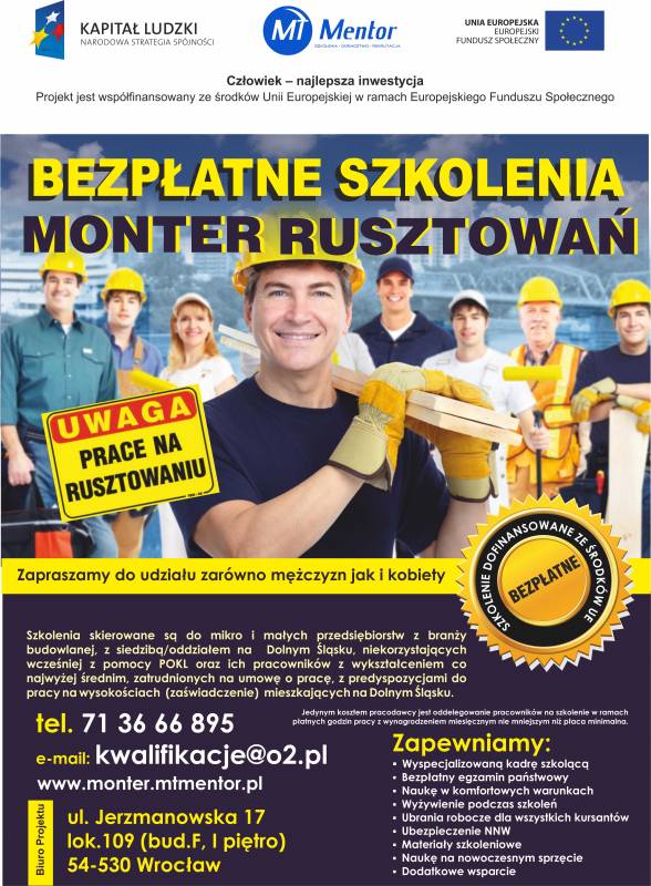 Organizowane będą na terenie całego Dolnego Śląska, mogą się odbyć również w Twoim mieście. Ze szkoleń skorzysta ponad 800 osób. Działanie jest odpowiedzią na potrzeby obecnego rynku pracy, który wymaga stałego podnoszenia kwalifikacji czy nabywania nowych uprawnień. Ma się przyczynić do ograniczenie deficytu wskazanych zawodów, podwyższenia konkurencyjności firm czy zmniejszenia liczby wypadków na palcach budowy. Pierwszeństwo do udziału w szkoleniach mają osoby niepełnosprawne. Aby dowiedzieć się czy możesz wziąć udział w szkoleniu skontaktuj się z Biurem Projektów pod nr tel. 71 36 66 895. Organizator MT Mentor „Adam Walczyk” zaprasza do zapoznania się z informacjami dostępnymi na stronach www.monter.mtmentor.pl lub www.windowanekwalifikacje.org.pl. Szkolenia są współfinansowane ze środków Unii Europejskiej w ramach Europejskiego Funduszu Społecznego.
