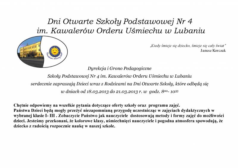 Serdecznie zapraszamy na Dni Otwarte w Szkole Podstawowej nr 4 w Lubaniu.