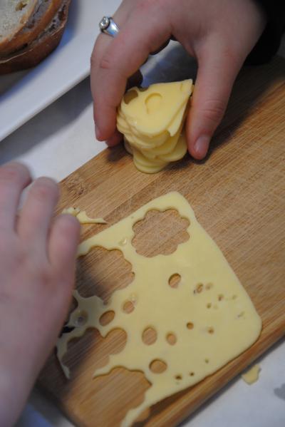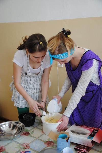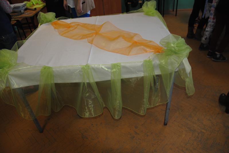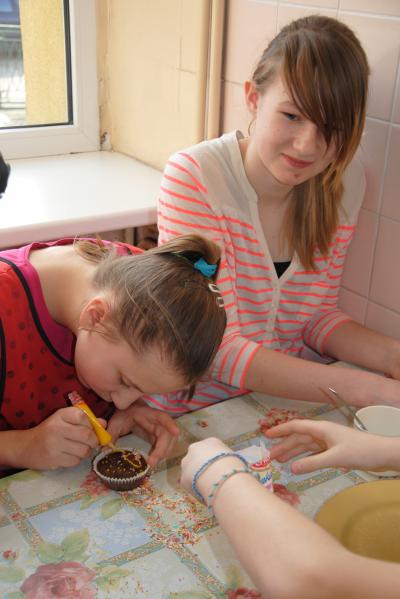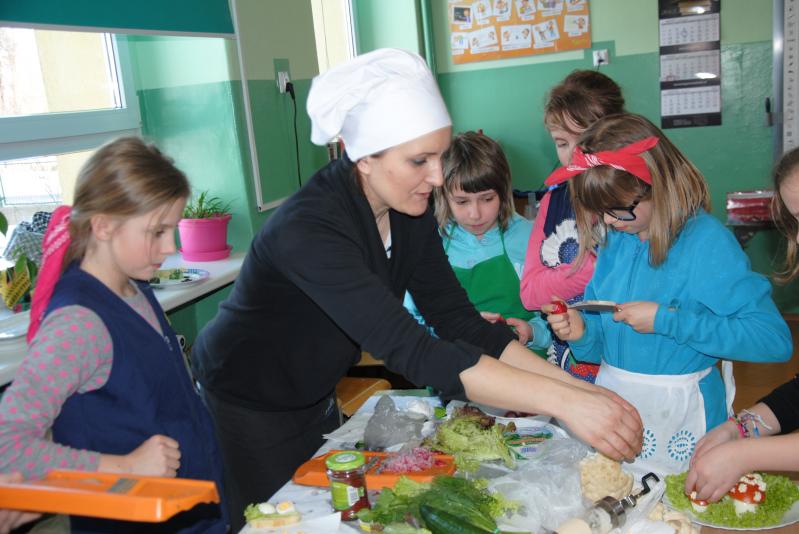 Uczniowie z wielkim zapałem złapali za deseczki i noże, pod okiem pani Anny przygotowywali składniki kanapek, nikt się nie nudził. W tym czasie tuż obok szykowany był piękny stół, efektownie ozdabiany przez dziewczynki, które jednocześnie uczyły się jak prawidłowo ułożyć na stole talerze i sztućce oraz samodzielnie składane na różne sposoby serwetki. A na stołówce nasi cukiernicy nie żałowali mąki i jaj, aby każda upieczona babeczka była dziełem sztuki.