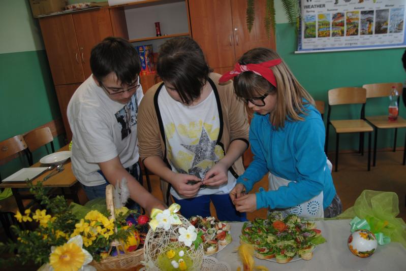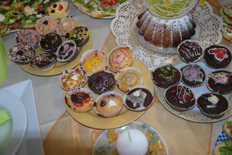 Po wzajemnym powitaniu przystąpiliśmy do podziału na grupy, które miały zająć się pieczeniem babeczek, dekoracją i nakryciem stołu, wykonaniem kanapek i jajeczek. Następnie grupa piekąca babeczki pod przywództwem pani Elwiry i pani Beaty udała się do swojego miejsca pracy, którym była nasza szkolna stołówka, a pozostałe grupy zabrały się do dzieła w sali nr 3 z panią Justyną i gośćmi.