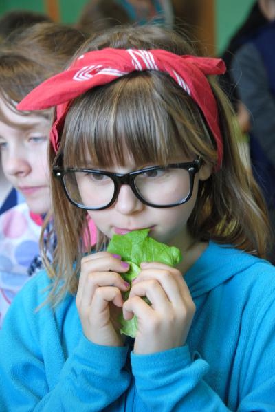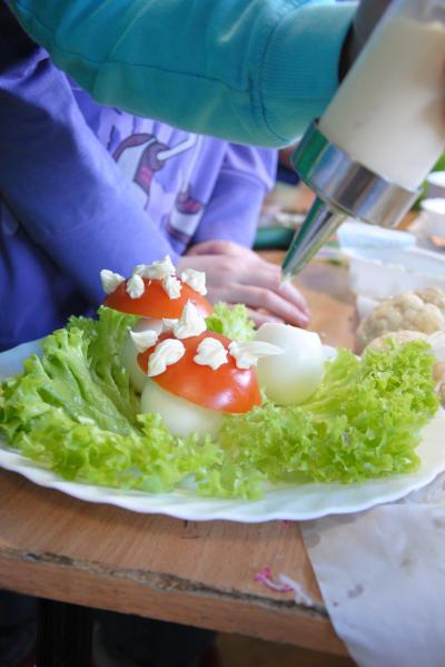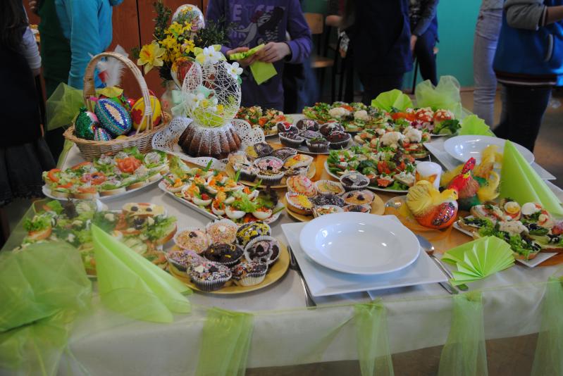 Efekty? Zapraszamy do galerii, chociaż chyba żadne zdjęcia nie są w stanie oddać zapachów i smaków, które doprowadzały wszystkich obecnych oczekujących na konsumpcję do wiosennej euforii :) Piękny stół, bogate w kolory i witaminy kanapki, wielokolorowe jajka, jadalne muchomorki, baranki z kalafiorów, przepiękne i pyszne babeczki - każdy obecny na warsztatach uczeń nabył tego dnia wiele przydatnych umiejętności, które można wykorzystać podczas przygotowań do Wielkanocy w domu.