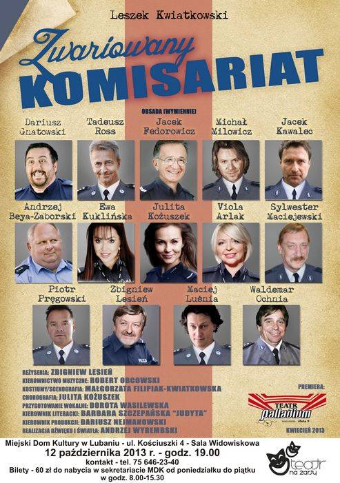 Już dziś zapraszamy na kolejny świetny spektakl w Miejskim Domu Kultury (ul. Kościuszki 4 - Sala Widowiskowa) - 12 października 2013 r., godz. 19.00. Kontakt - tel. 75 646-23-40. Bilety - 60 zł do nabycia w sekretariacie MDK od poniedziałku do piątku w godz. 8.00-15.30. WYSTĄPIĄ: Jacek Kawalec, Julita Kożuszek, Sylwester Maciejewski, Piotr Pręgowski oraz Zbigniew Lesień.