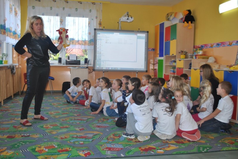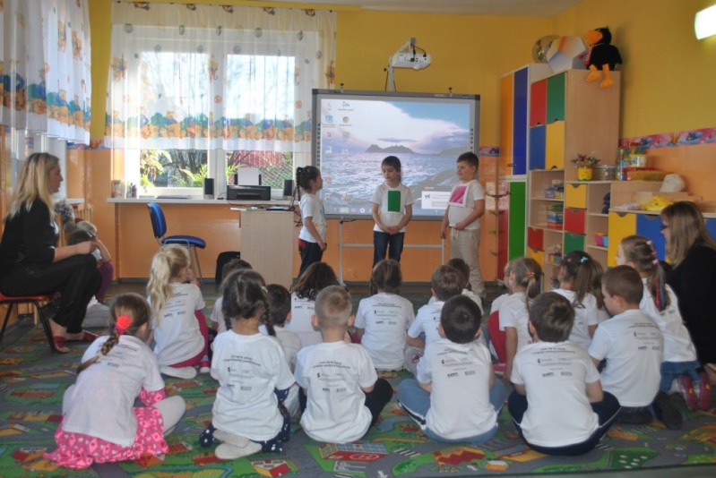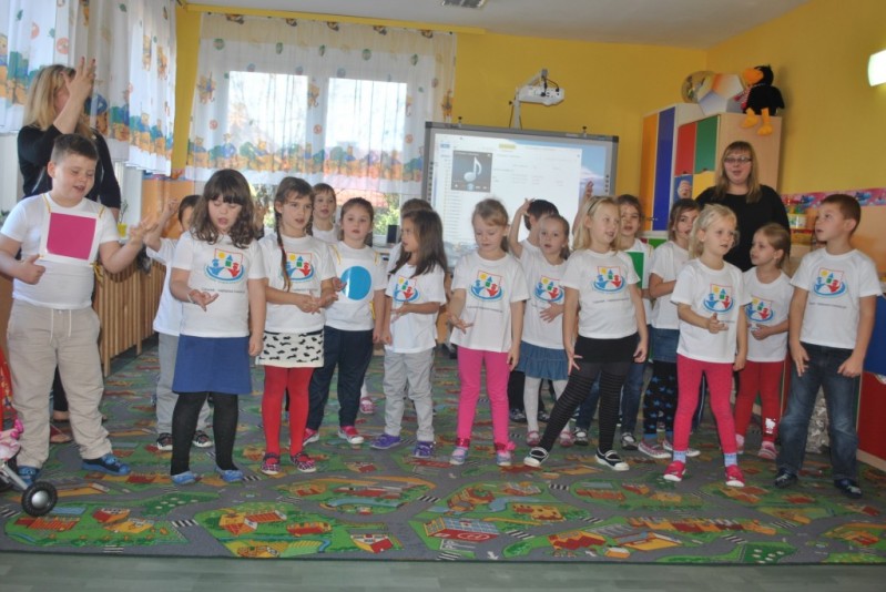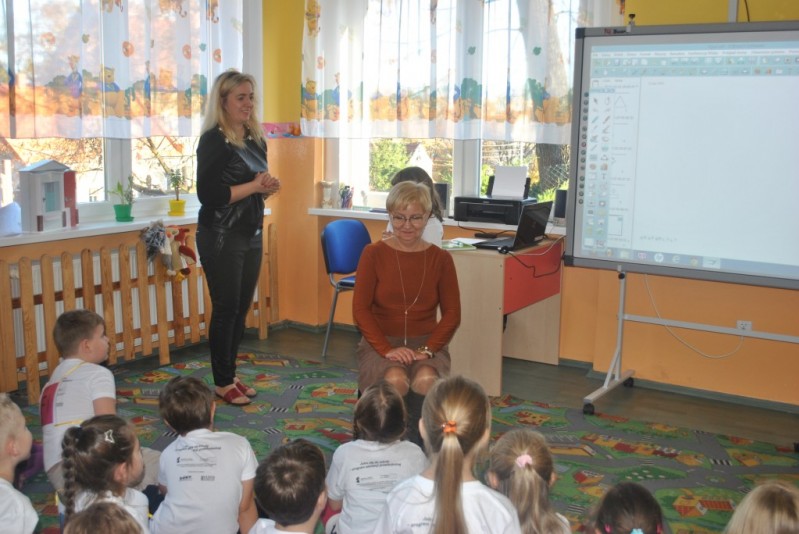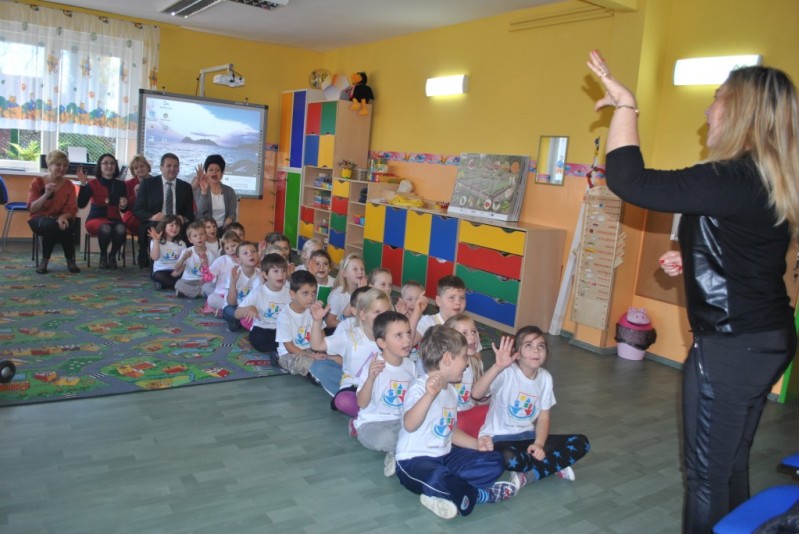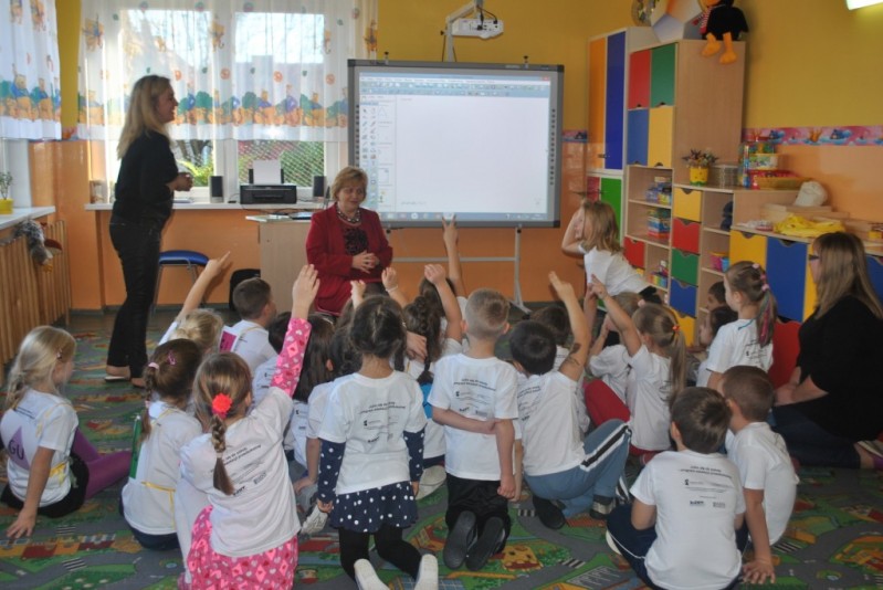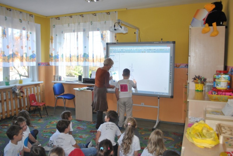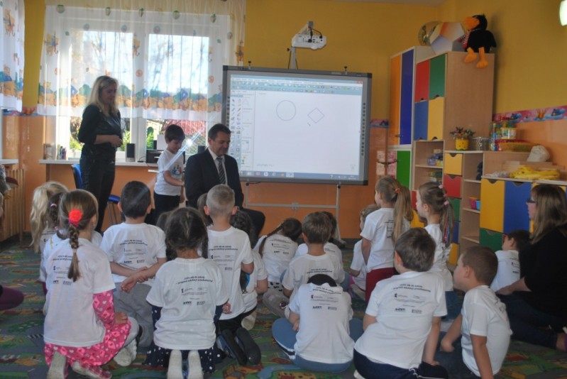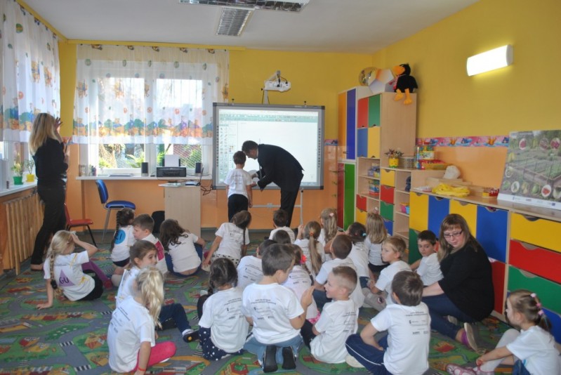 Realizacja treści programu stała się okazją do zorganizowania w przedszkolu zajęć otwartych, podczas których dzieci oprócz wiedzy z zakresu pojęć matematycznych zaprezentowały także umiejętności obsługi multimediów. Wykorzystanie tablicy multimedialnej w edukacji dzieci było również ciekawym doświadczeniem dl a dorosłych biorących aktywny udział w zajęciach . Do wspólnej zabawy z sześciolatkami dali zaprosić się m.in. burmistrz Arkadiusz Słowiński, dyrektor PCE i koordynator ds. programowo – merytorycznych w/w programu Anna Adamska, kierownik Referatu Edukacji i Sportu Anna Zawłocka oraz redaktor Teresa Kraska . Wspólna zabawa sprawiła wiele frajdy zarówno tym małym jak i tym dużym.