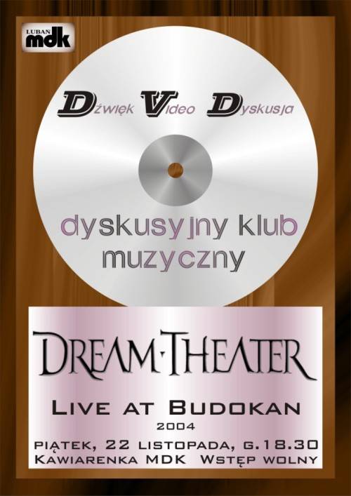 W piatek (22 listopada) o godz. 18.30 zapraszamy na kolejną odsłonę Dyskusyjnego Klubu Muzycznego. Tym razem zaprezentujemy koncert Live at Budokan z 2004 roku wirtuozerskiej grupy Dream Theater. Fanów przekonywać nie trzeba, a kto jeszcze nie zna tego zespołu-obecność obowiązkowa. Choćby dla gitarzysty, idola wielu instrumentalistów - Johna Petrucciego. Wrażenia wizualne i akustyczne gwarantowane. A pomoże w tym duży ekran, sceniczne oświetlenie i nagłośnienie w systemie 5.1. Zapraszamy.