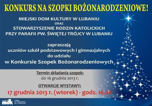 Zapraszamy wszystkich uczniów szkół podstawowych i gimnazjalnych do udziału w konkursie na szopkę bożonarodzeniową. Na najlepszych czekają nagrody! Szczegóły na plakacie.