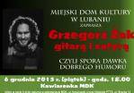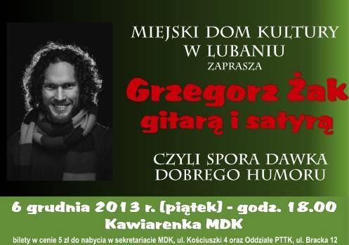 6 grudnia (piątek) o godz. 18.00 zapraszamy do Miejskiego Domu Kultury na mikołajkową porcję dobrego humoru. Na naszej kawiarenkowej scenie pojawi się Grzegorz Zak - artysta, kabareciarz i poeta. Jego "śpiewograny" program satyryczny z pewnością przypadnie Państwu do gustu i poprawi nastrój. Wstęp na wydarzenie to jedyne 5 zł, a warto je wydać także dlatego,że bilet na Grzegorza Żaka uprawni do promocyjnej ceny na grudniowy koncert Piwnicy pod Baranami. Zapraszamy!
