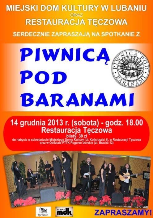 14 grudnia o godz. 18.00 Miejski Dom Kultury i Restauracja Tęczowa zapraszają na spotkanie z krakowską Piwnicą pod Baranami. Będzie jak zawsze ciekawie i klimatycznie. Bilety w cenie 30 zł do nabycia w sekretariacie MDK, Restauracji Tęczowa i lubańskim Oddziale PTTK. Przy jednoczesnym zakupie biletu na program Grzegorza Żaka (6 grudnia) bilet w cenie 25 zł. Polecamy transakcję wiązaną:) Do zobaczenia!