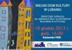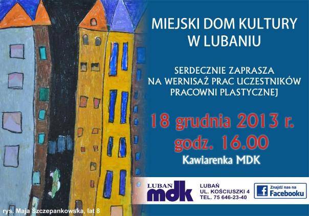Miejski Dom Kultury w Lubaniu zaprasza wszystkich miłośników sztuki na wernisaż prac uczestników pracowni plastycznej. Zapraszamy do kawiarenki MDK w środę 18 grudnia o godz. 16.00.