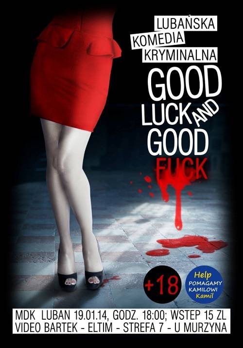 19 stycznia (niedziela) o godz. 18.00 zapraszamy do kawiarenki MDK na charytatywny pokaz lubańskiej komedii kryminalnej - "Good luck and good fuck" w reżyserii Bartosza Mereszki. Wstęp 15 zł, a całkowity dochód z projekcji przeznaczony będzie na leczenie Kamila Nowosielskiego. Zapraszamy!
