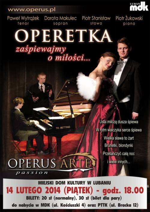 Już niedługo Walentynki - święto miłości. W ten dzień, 14 lutego (piątek) o godz. 18.00 zapraszamy Państwa do Sali Widowiskowej Miejskiego Domu Kultury w Lubaniu na operetkowy koncert „Zaśpiewajmy o miłości”. Koncert ten to bukiet muzyczny, łączący najpiękniejsze hity operetkowe i te mniej znane w spójną całość, którego podstawą jest miłość z jej wszystkimi odcieniami.