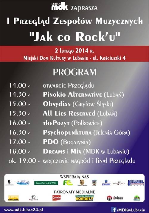 Już w najbliższą niedzielę 2 lutego o godz.14:00 w Sali Widowiskowej MDK w Lubaniu rozpocznie się I Przegląd Zespołów Muzycznych "Jak Co Rock`u". W przeglądzie weźmie udział 8 zespołów, co gwarantuje kilka godzin dobrej muzyki. Zespoły zaprezentują dowolnie wybrany repertuar, także możemy liczyć na wiele muzycznych niespodzianek. Niestety z przyczyn niezależnych od organizatora nie odbędzie się planowany wcześniej koncert zespołu JGL. A więc spotkajmy się w niedzielne popołudnie "Jak co Rock`u"