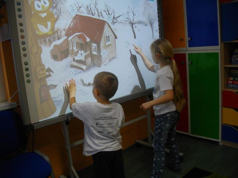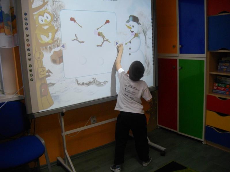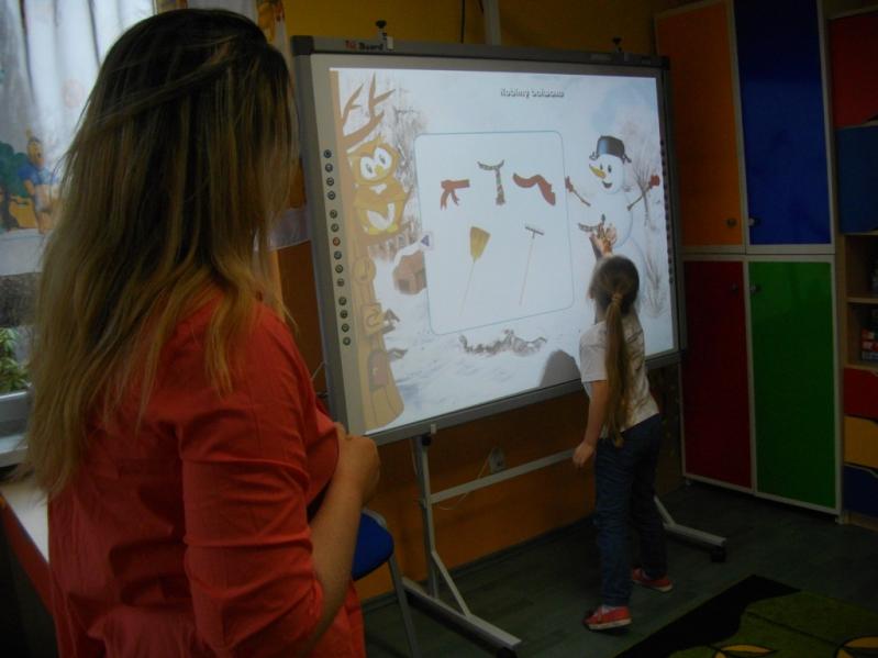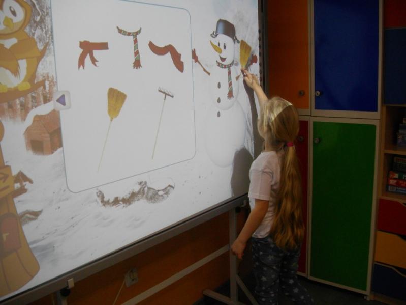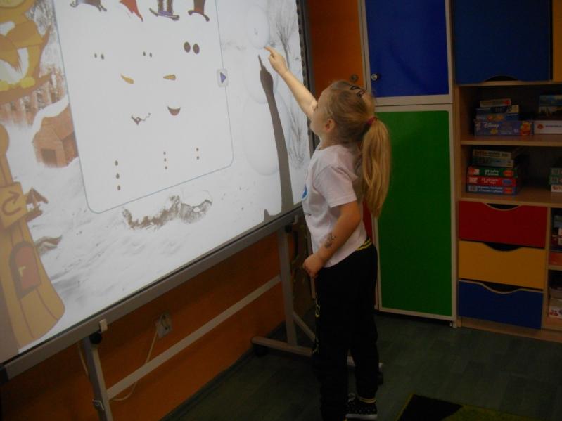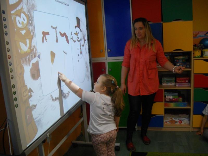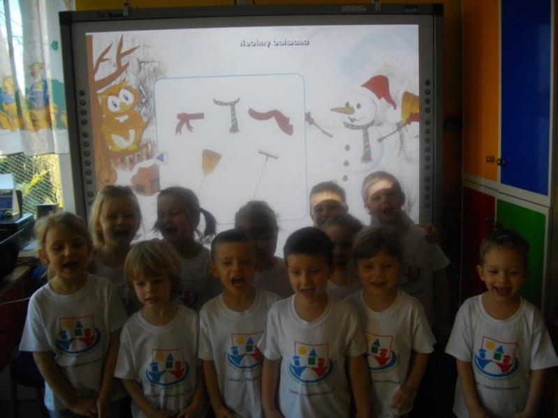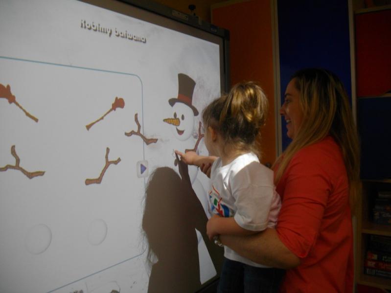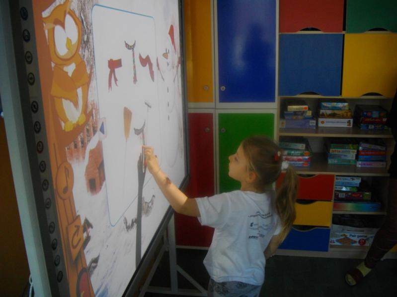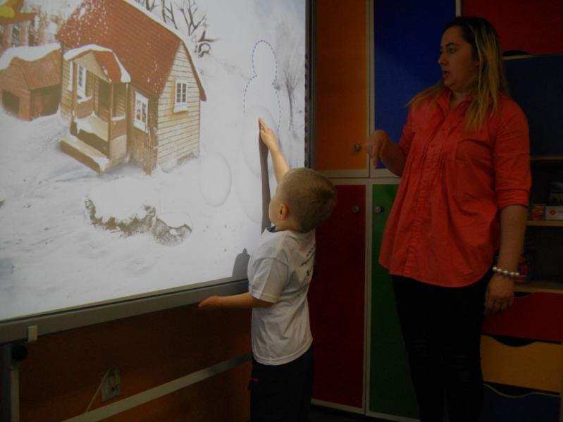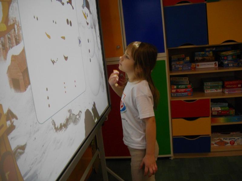 Zima niestety jaka jest wszyscy widzą – postanowiliśmy wyczarować ją więc przy pomocy tablicy multimedialnej. Wprawdzie to nie to samo co białe szaleństwo, ale przynajmniej udało nam się „ulepić” bałwana wirtualnie. Wszystkie zaproszone grupy bawiły się świetnie.