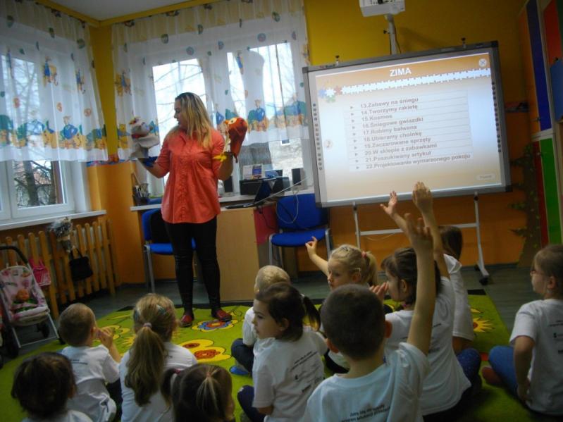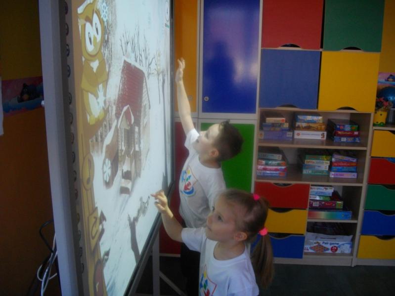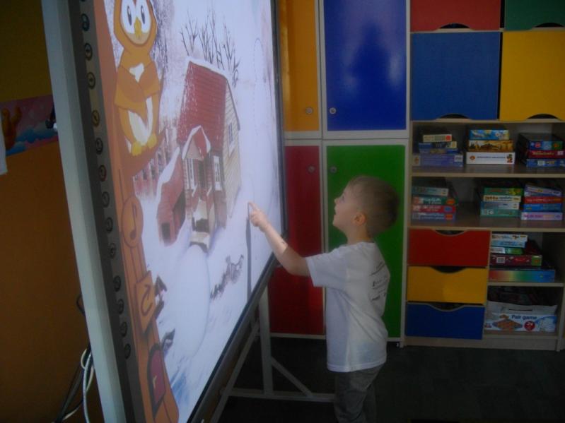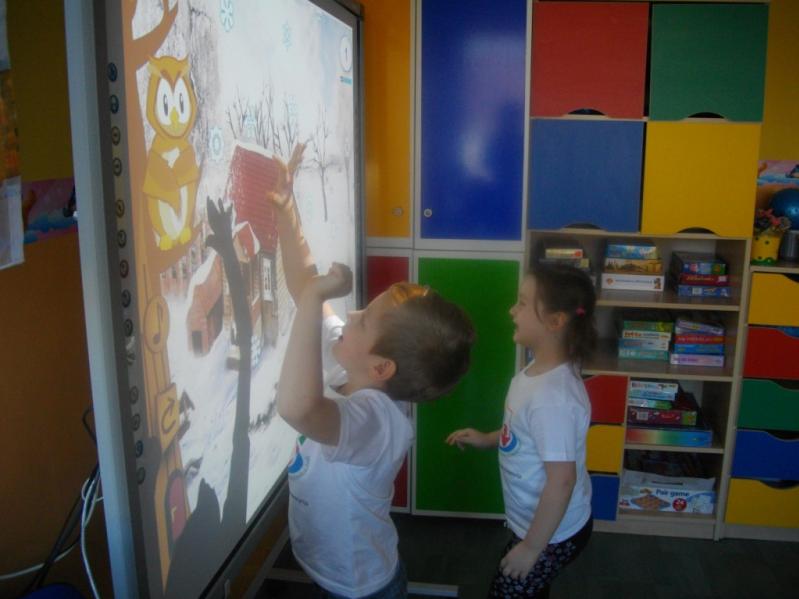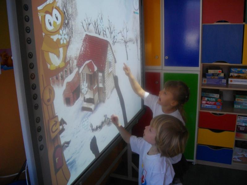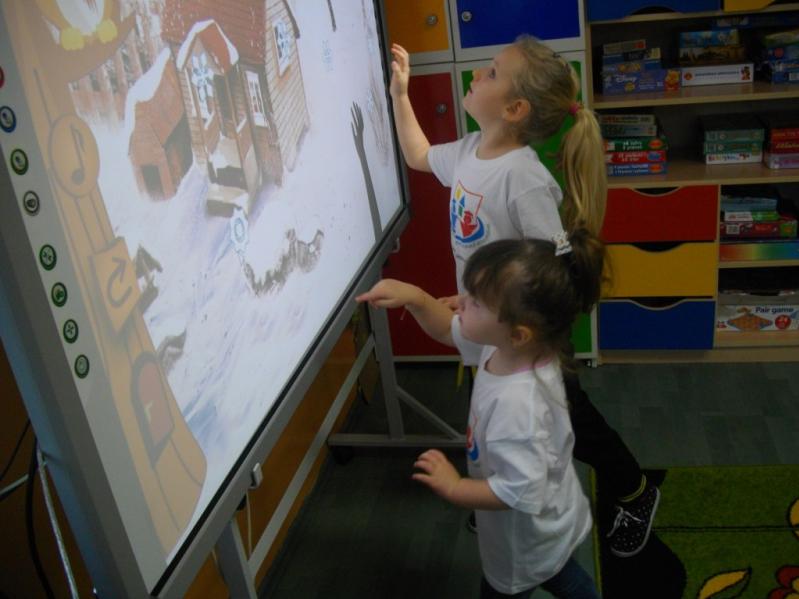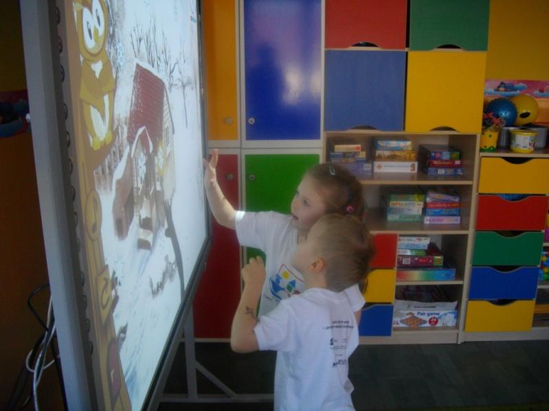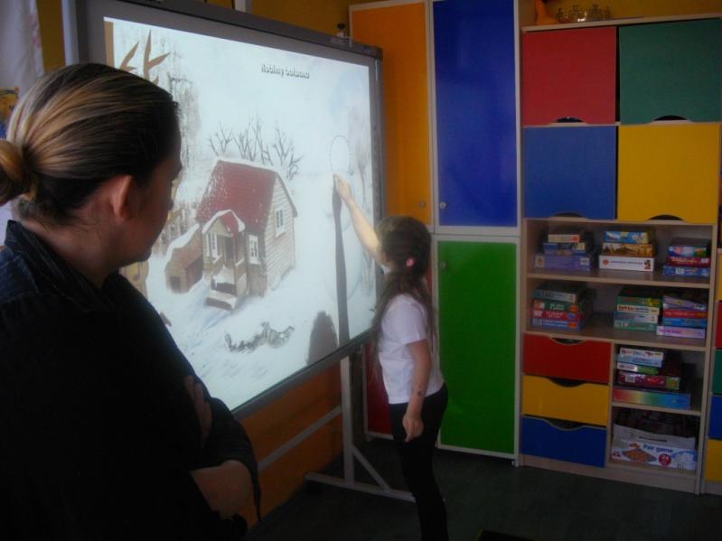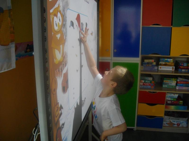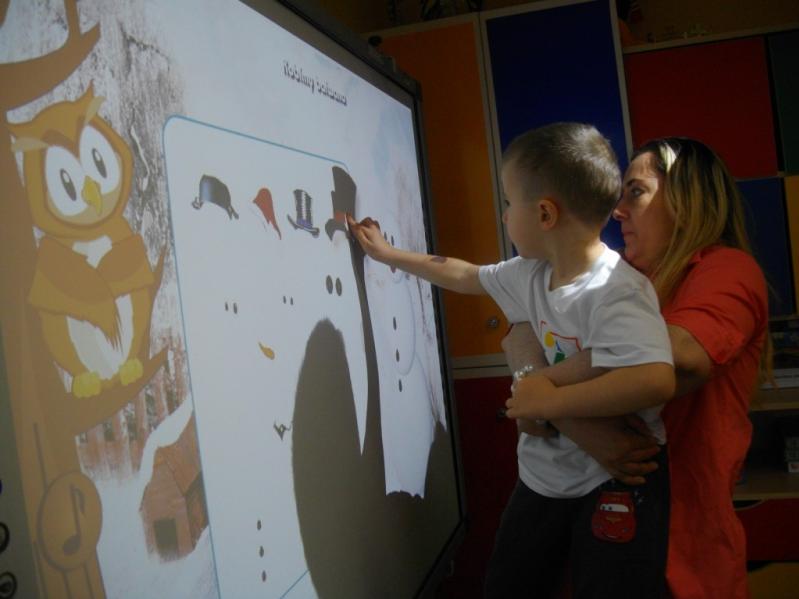 Zima niestety jaka jest wszyscy widzą – postanowiliśmy wyczarować ją więc przy pomocy tablicy multimedialnej. Wprawdzie to nie to samo co białe szaleństwo, ale przynajmniej udało nam się „ulepić” bałwana wirtualnie. Wszystkie zaproszone grupy bawiły się świetnie.