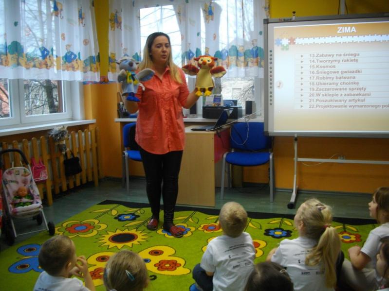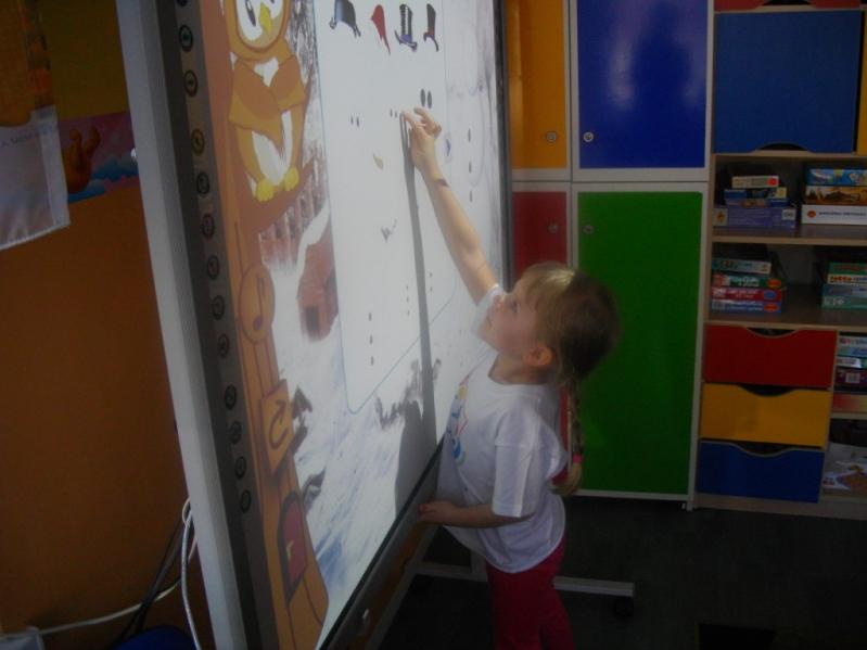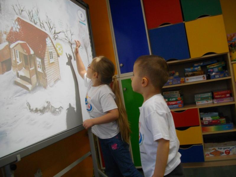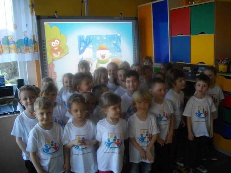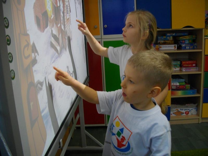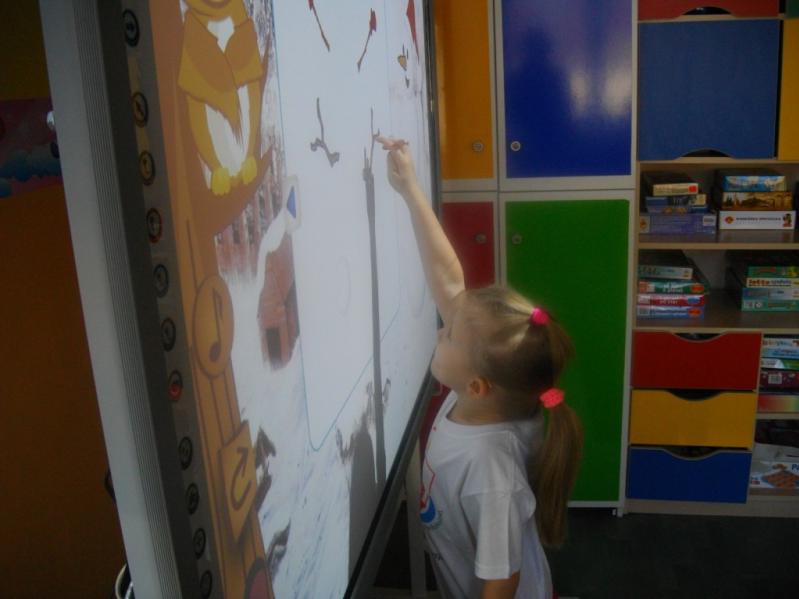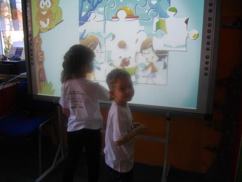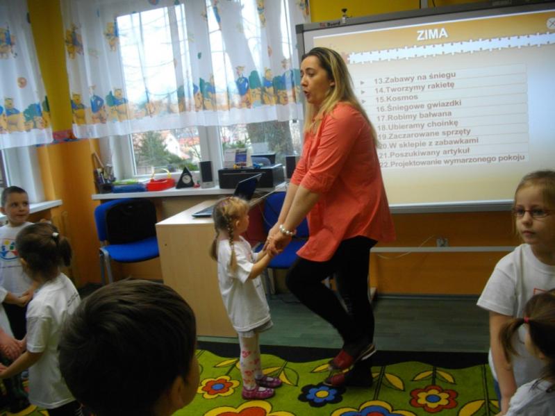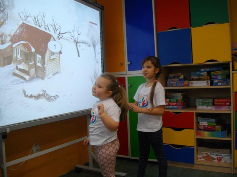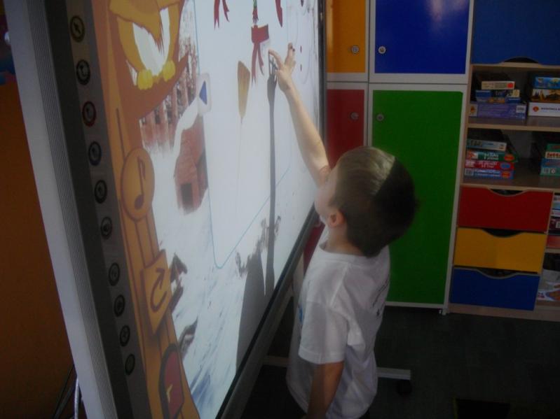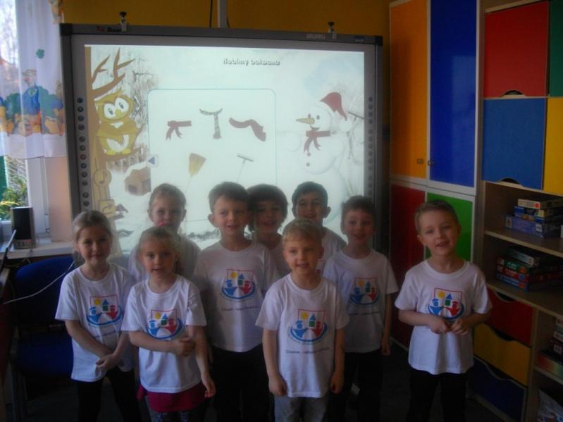 Zima niestety jaka jest wszyscy widzą – postanowiliśmy wyczarować ją więc przy pomocy tablicy multimedialnej. Wprawdzie to nie to samo co białe szaleństwo, ale przynajmniej udało nam się „ulepić” bałwana wirtualnie. Wszystkie zaproszone grupy bawiły się świetnie.