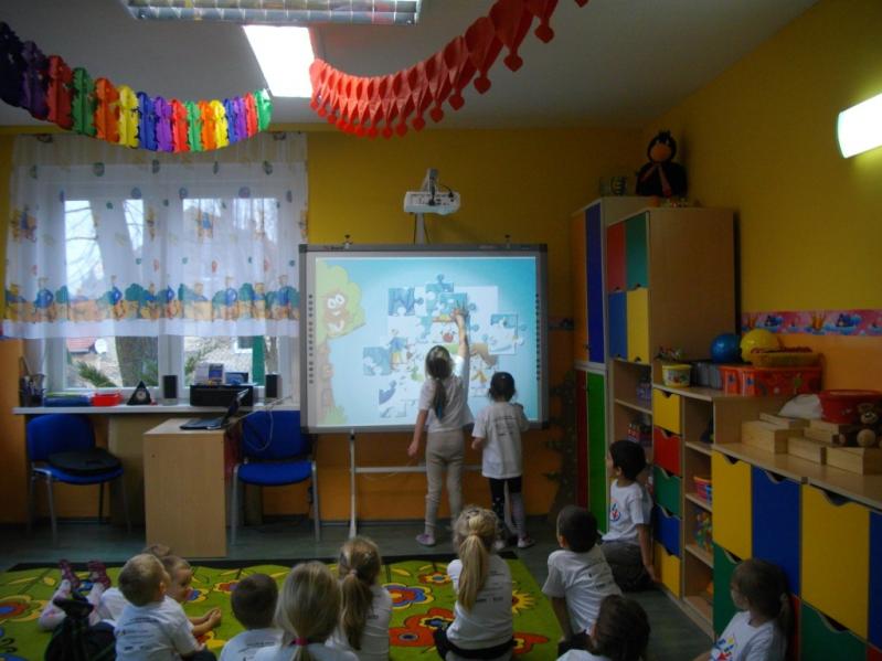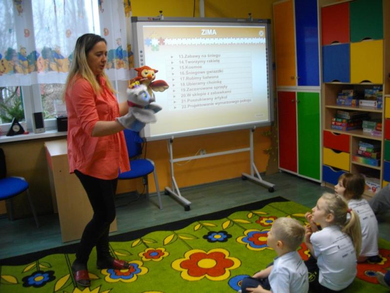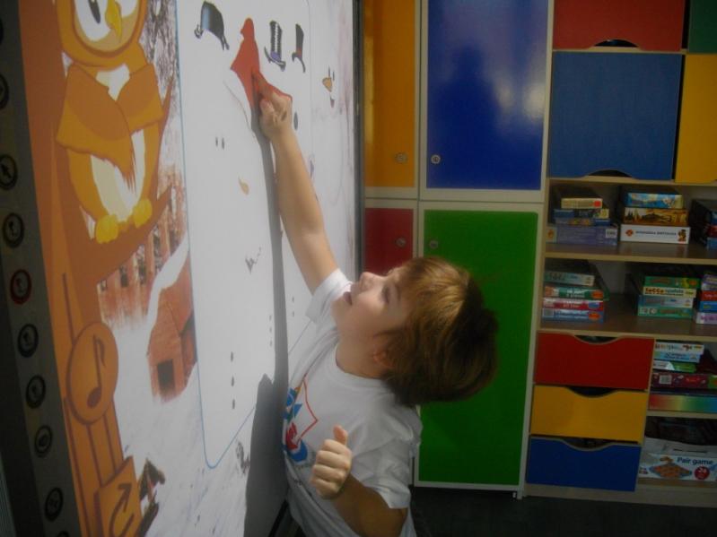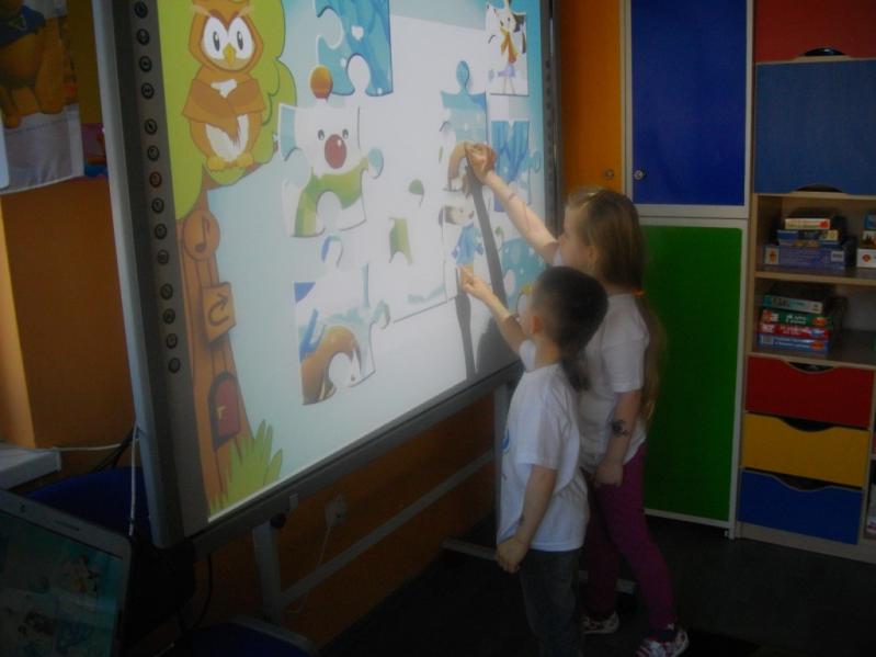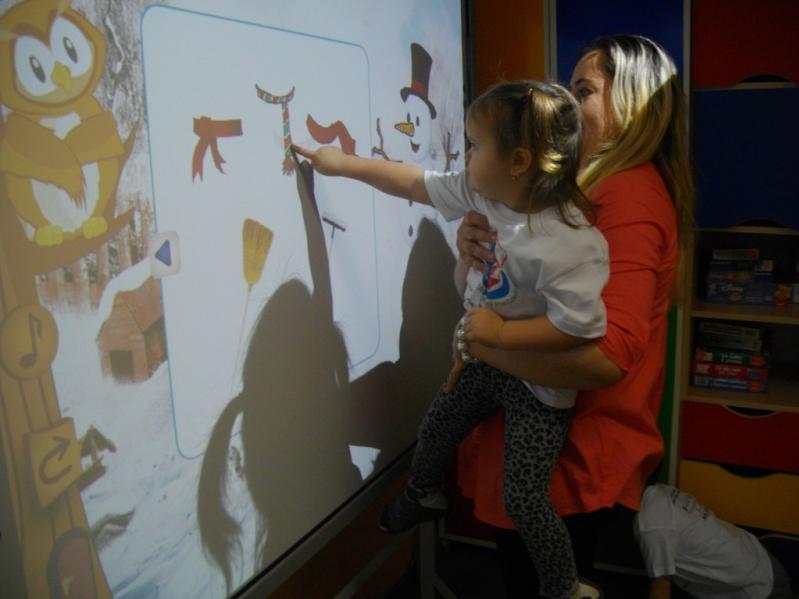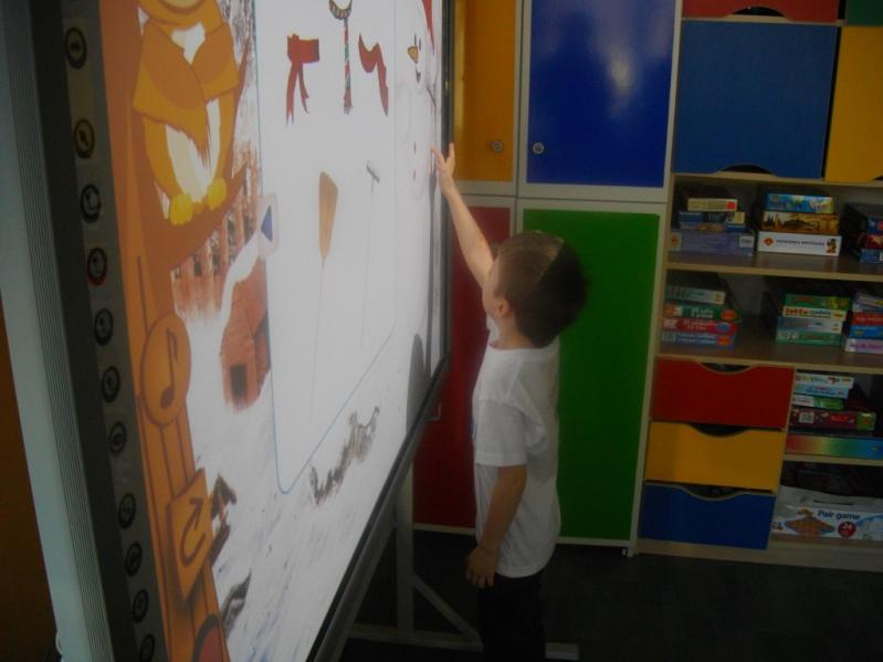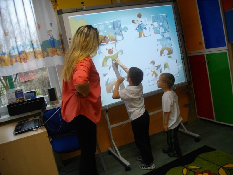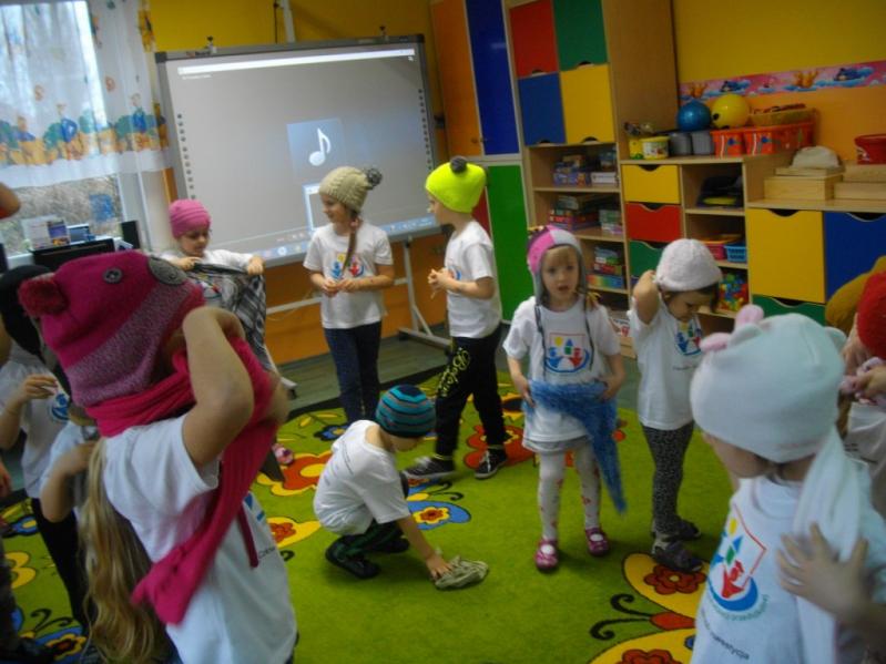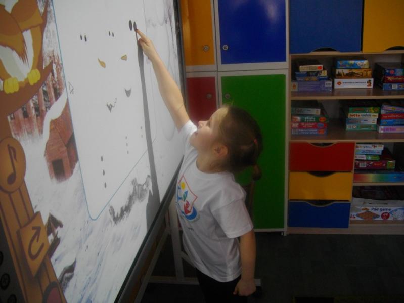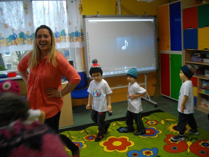 Zima niestety jaka jest wszyscy widzą – postanowiliśmy wyczarować ją więc przy pomocy tablicy multimedialnej. Wprawdzie to nie to samo co białe szaleństwo, ale przynajmniej udało nam się „ulepić” bałwana wirtualnie. Wszystkie zaproszone grupy bawiły się świetnie.