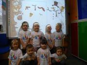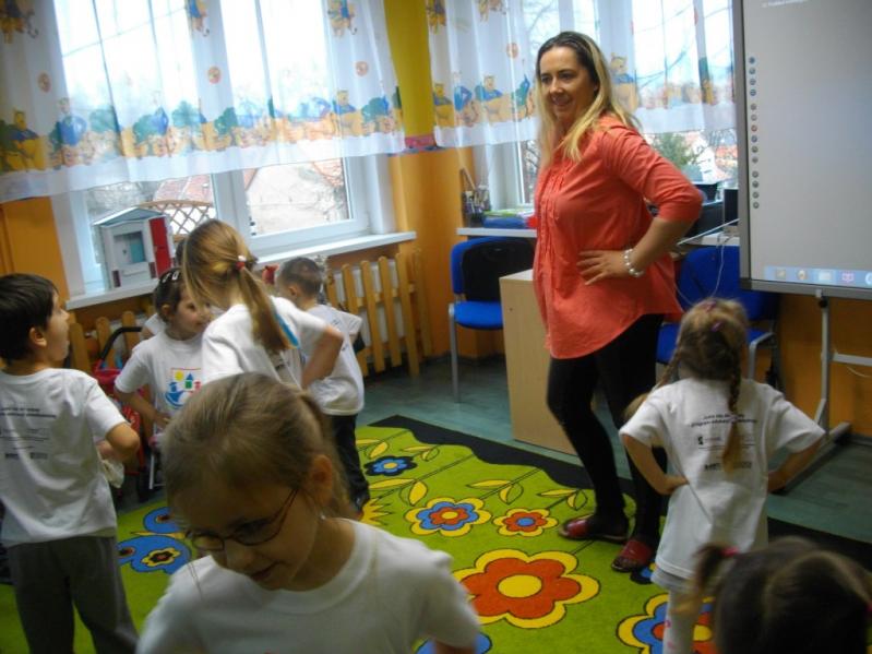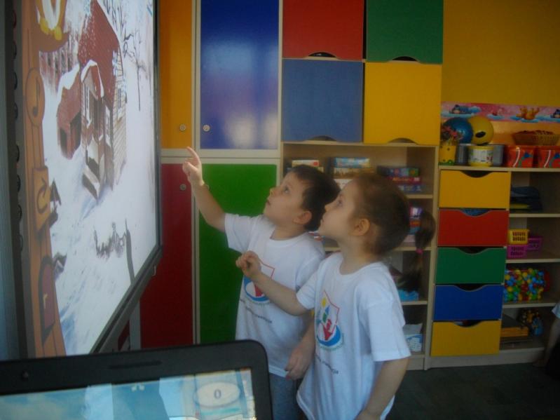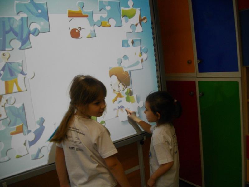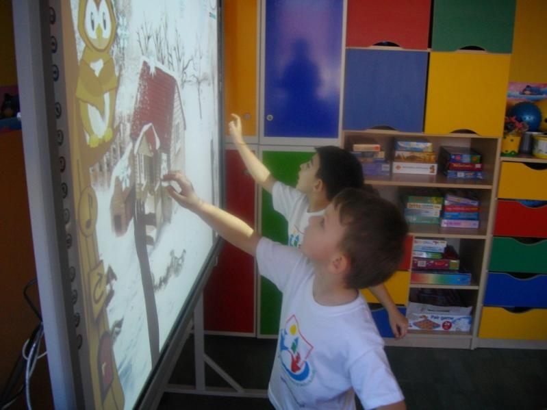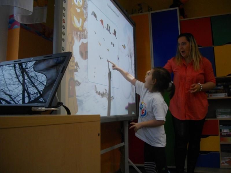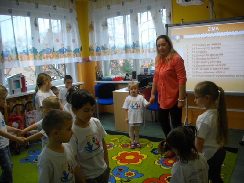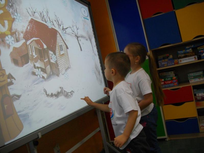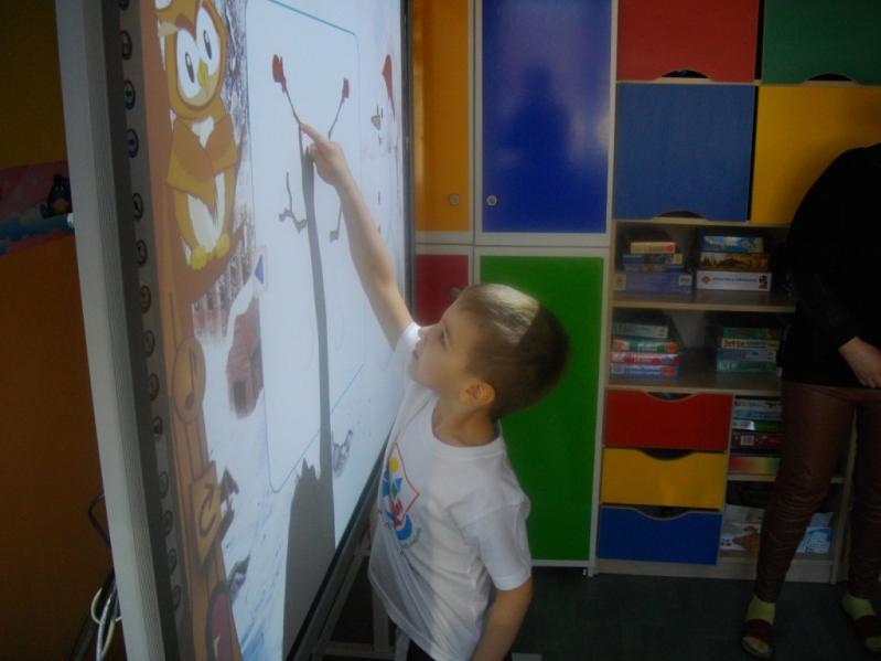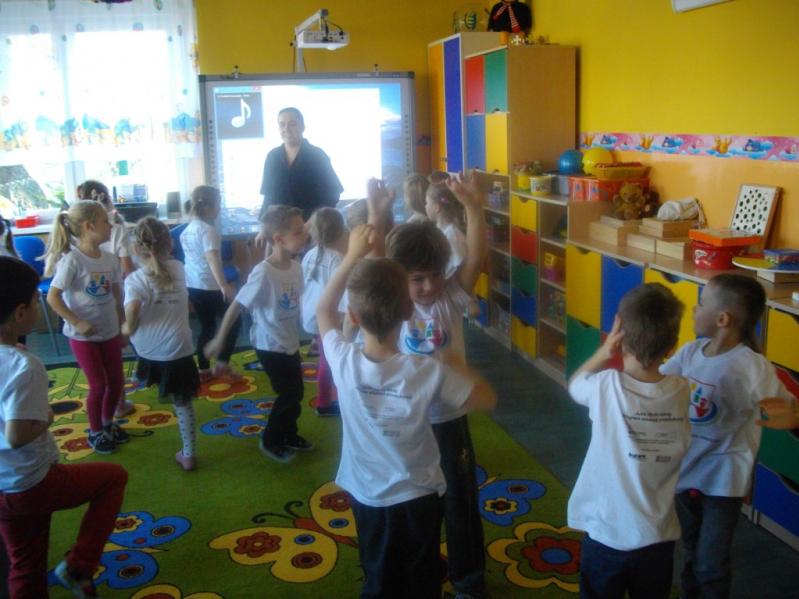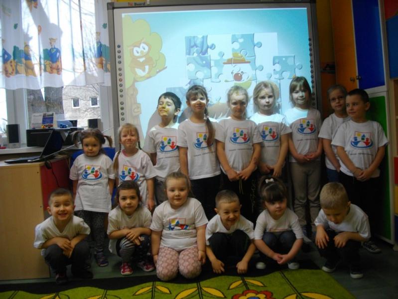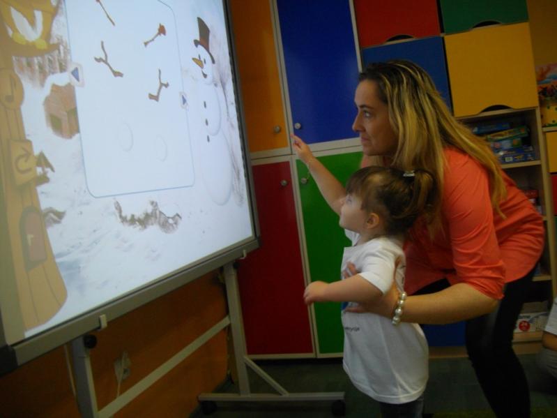 Zima niestety jaka jest wszyscy widzą – postanowiliśmy wyczarować ją więc przy pomocy tablicy multimedialnej. Wprawdzie to nie to samo co białe szaleństwo, ale przynajmniej udało nam się „ulepić” bałwana wirtualnie. Wszystkie zaproszone grupy bawiły się świetnie.