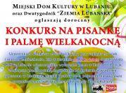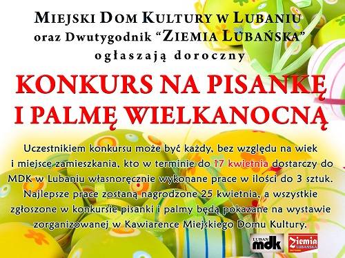 Miejski Dom Kultury wraz z redakcją dwutygodnika "Ziemia Lubańska" zaprasza do udziału w corocznym "Konkursie na Pisankę i Palmę Wielkanocną". Wykonane prace należy dostarczyć do Sekretariatu MDK przy ul. Kościuszki 4, nie później niż do 17 kwietnia. Laureatów konkursu poznamy 25 kwietnia. Wszystkie zgłoszone prace zostaną zaprezentowane na wystawie w Kawiarence Miejskiego Domu Kultury