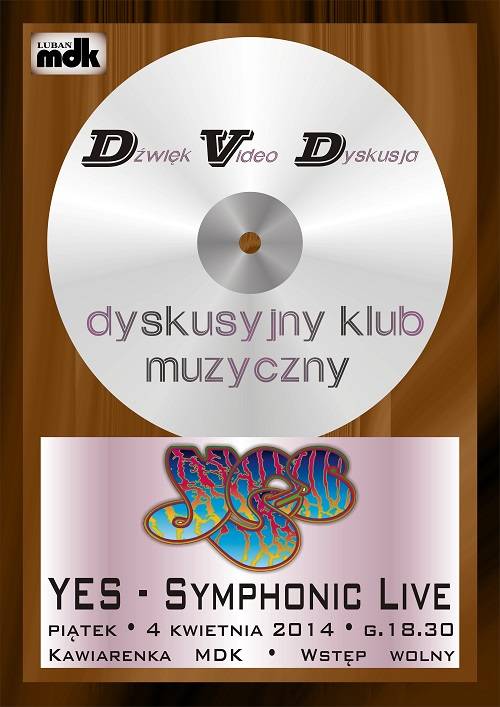 Zapraszamy na kolejne spotkanie Dyskusyjnego Klubu Muzycznego. 4 kwietnia o godz. 18:30 w Kawiarence Miejskiego Domu Kultury przy scenicznym nagłośnieniu 5.1, na dużym ekranie zobaczyć będzie można koncert grupy Yes - Symphonic Live. Wstęp wolny