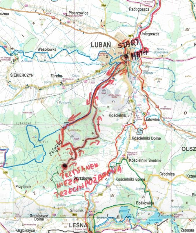 Trasa rajdu przebiegać  będzie ulicami Lubania do Wielkiego Lasu Lubańskiego,  z przystankiem  i nawrotem przy wieży przeciwpożarowej na Górze Liściastej (trasa o długości ok. 20 km).