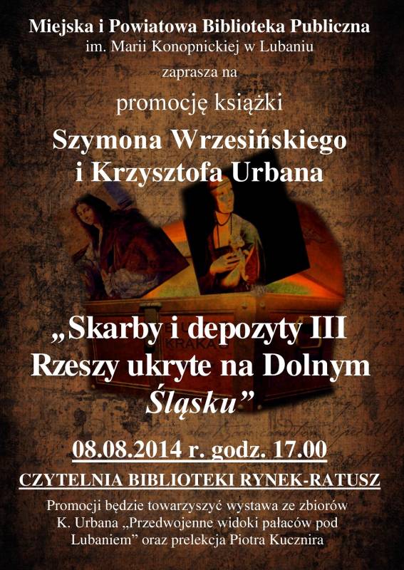 Miejska i Powiatowa Biblioteka Publiczna im. Marii Konopnickiej w Lubaniu zaprasza na promocję książki Szymona Wrzesińskiego i Krzysztofa Urbana "Skarby i depozyty III Rzeszy ukryte na Dolnym Śląsku". Spotkanie z autorami odbędzie się dn. 08.08.2014 r. godz 17:00 w Czytelni Biblioteki (Rynek- Ratusz). Promocji towarzyszyć będzie wystawa ze zbiorów K. Urbana "Przedwojenne widoki pałaców pod Lubaniem" oraz prelekcja Piotra Kucznira.