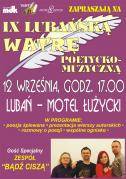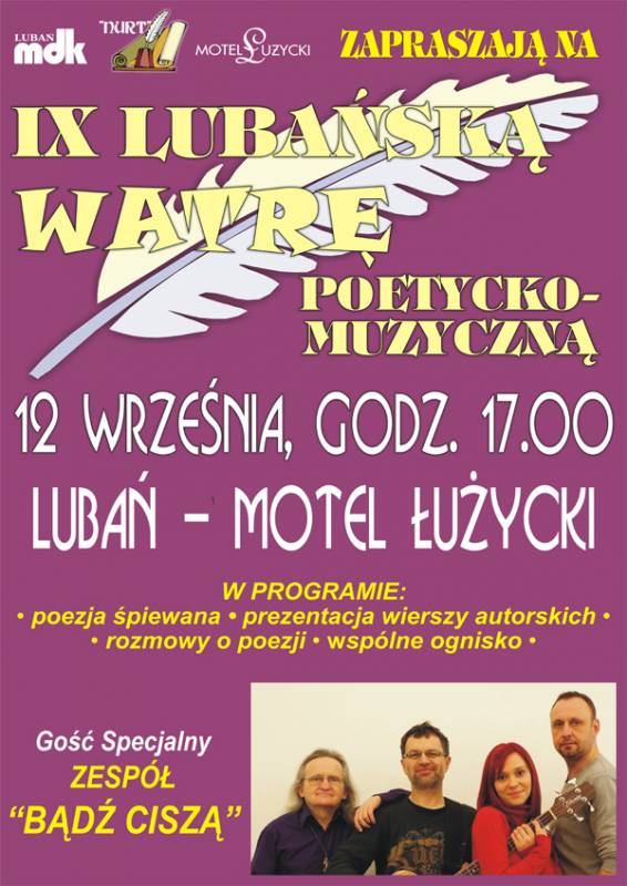 Miejski Dom Kultury w Lubaniu oraz Grupa Literacka Nurt mają zaszczyt zaprosić na IX Lubańską Watrę Poetycko - Muzyczną, która odbędzie się 12 września (piątek) o godz. 17:00 w ogrodach Motelu Łużyckiego. W programie prezentacja wierszy autorskich, poezja śpiewana, wspólne ognisko. Gościem muzycznym watry będzie zespół "Bądź ciszą".