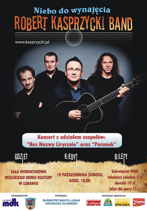 Zapraszamy na koncert "Niebo do wynajęcia" z udziałem lubańskich zespołów "Bez Nazwy Lirycznie" oraz "Poranek". Gwiazdą wieczoru będzie Robert Kasprzycki z zespołem - legenda muzyki z nurtu krainy łagodności, promujący swoją najnowszą płytę. Koncerty odbędzie się 18 października (sobota), o godz. 18:00 w sali widowiskowej Miejskiego Domu Kultury w Lubaniu. Bilety w cenie 5 zł, 10 zł i 15 zł do nabycia w sekretariacie MDK.