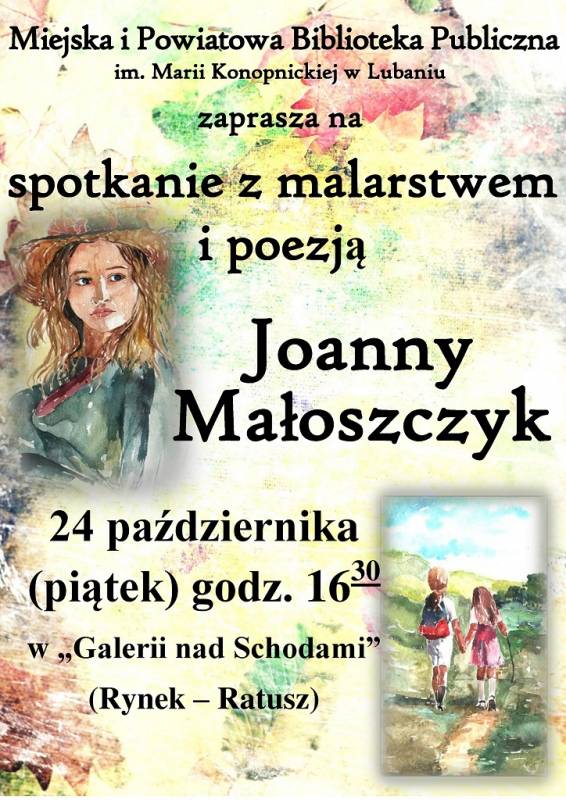 Miejska i Powiatowa Biblioteka Publiczna im. Marii Konopnickiej w Lubaniu zaprasza na spotkanie z malarstwem i poezją Joanny Małoszczyk, które odbędzie się dnia 24.10.2014 r. o godz. 16:30 w "Galerii nad Schodami" (Rynek- Ratusz).