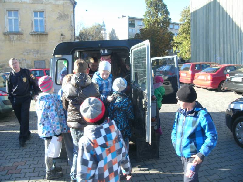 Podczas tej niecodziennej wizyty nie mogła zabraknąć tego, na co przede wszystkim dzieci czekały - zapoznania się z pojazdami służbowymi. Każde z dzieci mogło usiąść w radiowozie, chętnych oczywiście nie brakowało.