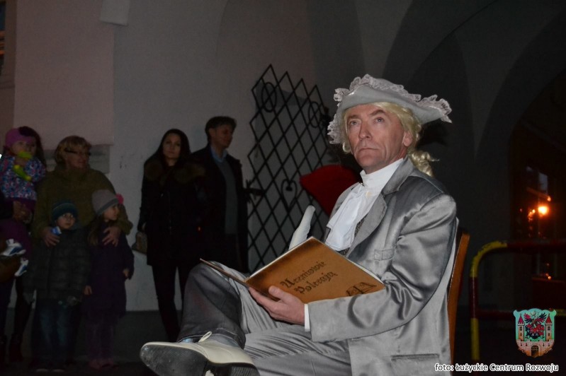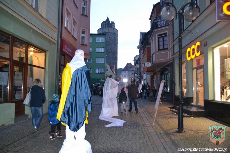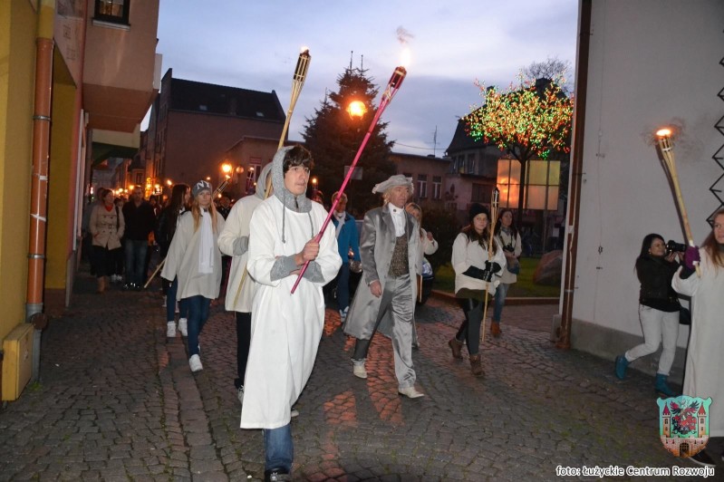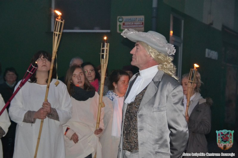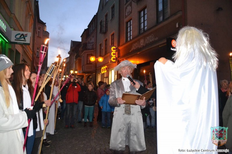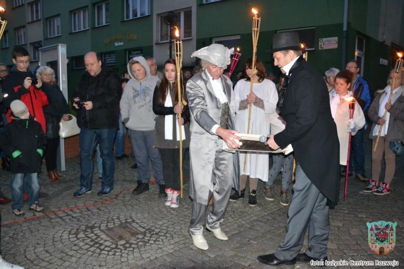 Punktualnie o godz. 18:00 Johann Wolfgang Goethe przekroczył „Bramę Bracką”. Następnie oświetlony  z Wieży Brackiej teatralnym reflektorem przeszedł przez szpaler 20 osób trzymających pochodnie. Po pokonaniu kilkunastu metrów, doszedł do miejsca, w którym umieszczono pamiątkową tablicę. Trzeba koniecznie nadmienić, że powierzchnia drogi po której stąpał poeta była gęsto zapisana fragmentami jego dzieł.  Tam właśnie wielkiego pisarza powitał oficjalnie, oczywiście w stroju z epoki  burmistrz Lubania Arkadiusz Słowiński. Po wymianie kilku grzeczności burmistrz odsłonił tablicę a Goethe ruszył w stronę Ratusza. Po drodze używając sentencji prezentował „żywe posągi” symbolizujące jego największe dzieła.  Kiedy dotarł na rynek we mgle i świetle reflektorów rozpoczęło się mroczne przedstawienie mające ukazać burzę uczuć i namiętności nękających umysł i duszę wielkiego twórcy.