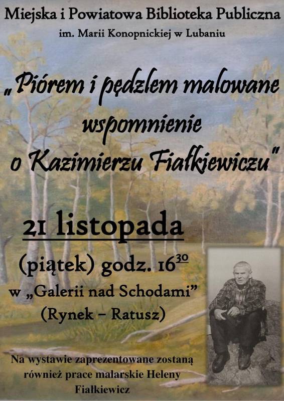 Miejska i Powiatowa Biblioteka Publiczna im. Marii Konopnickiej w Lubaniu zaprasza na „Piórem i pędzlem malowane wspomnienie o Kazimierzu Fiałkiewiczu" 21 listopada 2014 godz 16:30
