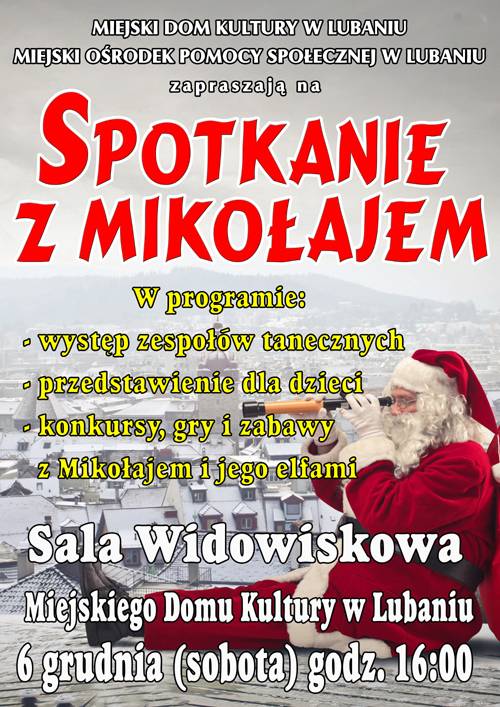 Zapraszamy do Miejskiego Domu Kultury na Spotkanie z Mikołajem. 6 grudnia (sobota) o godz. 16:00 w sali widowiskowej pojawią się renifery, elfy no i oczywiście najważniejszy gość Święty Mikołaj z prezentami. Oprócz tego wystąpią zespoły taneczne MDK, dla najmłodszych przygotowano malowanie twarzy, konkursy oraz spektakl w wykonaniu Teatru Mała Bajeczka, a dla rodziców słodkie wypieki. Także nikt nie będzie się nudził, zapowiadają się 2 godziny doskonałej zabawy. Zapraszamy