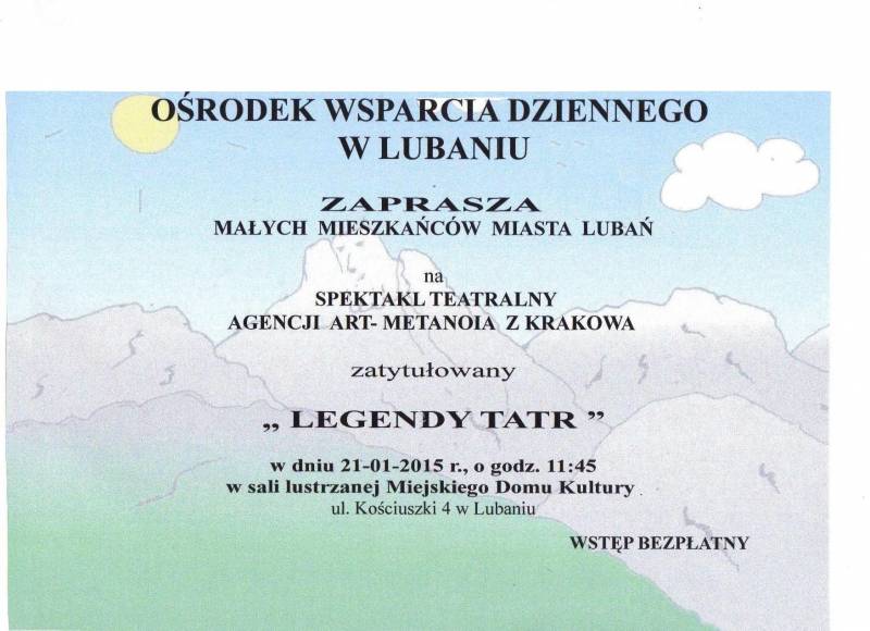 Ośrodek Wsparcia Dziennego w Lubaniu zaprasza małych mieszkańców miasta Lubań na spektakl teatralny agencji Art- Metanoia z Krakowa zatytułowany „Legendy Tatr”.