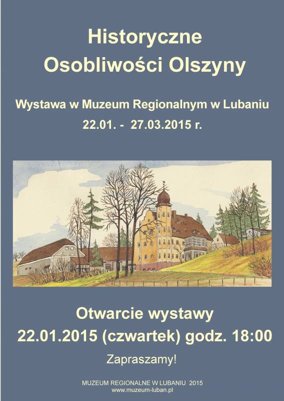 Serdecznie zapraszamy wszystkich mieszkańców Lubania i okolic do Muzeum Regionalnego 22 stycznia 2015 r. O godzinie 18:00 odbędzie się otwarcie wystawy pt. "Historyczne Osobliwości Olszyny", która opowie o ciekawostkach z dziejów tej śląskiej miejscowości. Ekspozycję będzie można oglądać do 27 marca 2015 r. Zapraszamy!
