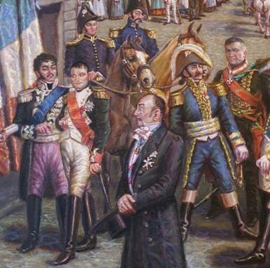Dzieło przedstawia   cesarza przy  ozdobnym portalu budynku dawnej Szkoły Ceglarskiej (ulicy Richterstrasse  2, obecnie Spółdzielcza) w otoczeniu lubańskich rajców i mieszczan.  Miejscowi notable udają radość z przybycia Napoleona, natomiast ubodzy  mieszkańcy stojący w oddali są niezadowoleni z wizyty Cesarza. W tle  widzimy   rynek z ówczesną zabudową, a w oddali wieżę kościoła. W obrazie  dominują barwy jasne, optymistyczne.Wzrok przyciągają    zindywidualizowane postacie, konie, galowe mundury, barwne stroje  mieszczan oraz detale architektoniczne.