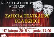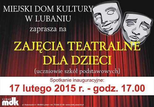 Miejski Dom Kultury w Lubaniu ogłasza nabór na zajęcia teatralne "Zabawa w teatr" dla dzieci. Zajęcia przeznaczone są dla uczniów szkół podstawowych. Osoby chętne zapraszamy, wraz z rodzicami, na spotkanie organizacyjne, które odbędzie się 17 lutego o godz.17.00 w MDK.
