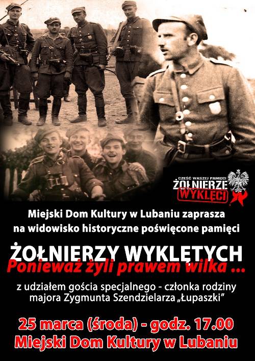1 marca obchodzimy Narodowy Dzień Pamięci „Żołnierzy Wyklętych". W Lubaniu tak, jak w całym kraju odbyły się uroczystości ku czci "Żołnierzy Wyklętych". Aby jeszcze bardziej przybliżyć historię żołnierzy niezłomnych, szczególnie młodemu pokoleniu, zapraszamy na widowisko historyczne "Ponieważ żyli prawem wilka", które odbędzie się 25 marca (środa), w Galerii Foyer Miejskiego Domu Kultury w Lubaniu o godz. 17.00
