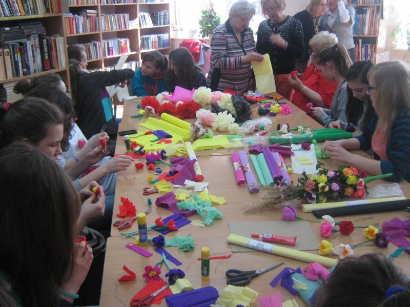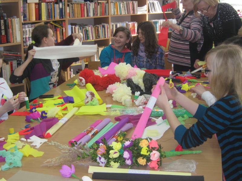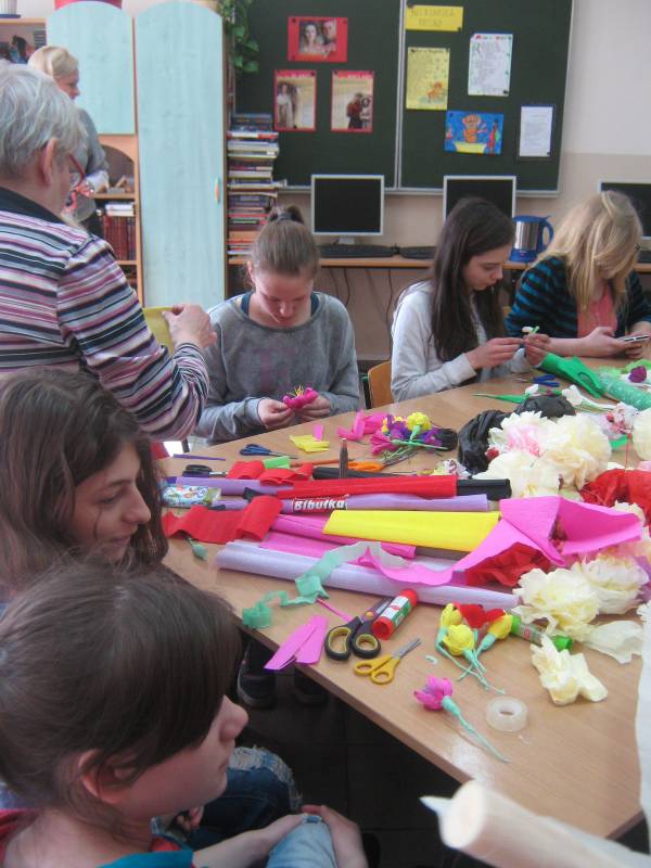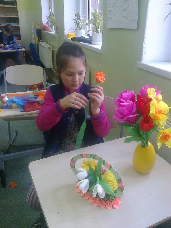 Zajęcia były okazją do doskonalenia swojej sprawności manualnej,cierpliwości poprzez wykonywanie różnorodnych kwiatów z kolorowej bibuły, a następnie stworzenia niepowtarzalnej, jedynej w swoim rodzaju palmy wielkanocnej.